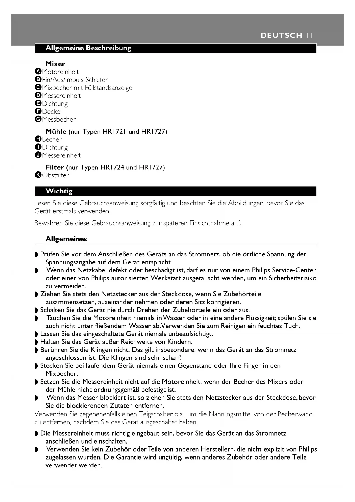 Serve hot or cold. Mill Only types HR 1721 and HR 1727 How to use the mill 1 Put the ingredients in the jar (H) (fig. 9). You can process wet and dry ingredients. ENGLISH 92 Do not fill the jar beyond the "MAX" indication. 3 Put the larger sealing ring (I) on the blade unit of the mill (J) (fig. 10). Make sure that the rubber sealing ring has been placed correctly. 4 Screw the blade unit on the jar by turning it clockwise (fig. 11). 5 Hold the assembled mill upside down and screw it onto the motor unit (A) by turning it clockwise until you hear a 'click' (fig. 12) . 6 Make sure that the appliance is plugged in. 7 Switch the appliance on and let it run until the ingredients are fine enough.This will take approx. 10-30 seconds. Disassembling the mill 1 Unplug the appliance. 2 If the mill is still attached to the motor unit, remove the mill from the motor unit by turning it anticlockwise. 3 Place the mill upside down, unscrew the jar (anti-clockwise) and then remove the blade unit. 4 Always clean the removable parts immediately after use. Cleaning We advise you to clean the removable parts immediately after use. Always unplug the appliance before cleaning. ◗ Never clean the motor unit, the blade units, the filter and the sealing rings in the dishwasher. ◗ Always disassemble all removable parts before cleaning them. Do not forget to remove the sealing rings from the blade units (blender and mill). ◗ Avoid touching the blades.The blades are very sharp. The blender and mill jar (without blade unit), lid and measuring cup are dishwasher-proof. Motor unit ◗ Clean the motor unit with a moist cloth. Do not rinse the motor unit under the tap. Do not use abrasives, scourers, alcohol, etc. Storage You can store excess mains cord by winding it round the base of the motor unit. Environment ◗ Do not throw the appliance away with the normal household waste at the end of its life, but hand it in at an official collection point for recycling. By doing this you will help to preserve the environment (fig. 13). Guarantee & service If you need information or if you have a problem, please visit the Philips Web site at www.philips.com or contact the Philips Customer Care Centre in your country (you will find its phone number in the worldwide guarantee leaflet). If there is no Customer Care Centre in your country, turn to your local Philips dealer or contact the Service Department of Philips Domestic Appliances and Personal Care BV. ENGLISH10Allgemeine Beschreibung Mixer A Motoreinheit B Ein/Aus/Impuls-Schalter C Mixbecher mit Füllstandsanzeige D Messereinheit E Dichtung F Deckel G Messbecher Mühle (nur Typen HR1721 und HR1727) H Becher I Dichtung J Messereinheit Filter (nur Typen HR1724 und HR1727) K Obstfilter Wichtig Lesen Sie diese Gebrauchsanweisung sorgfältig und beachten Sie die Abbildungen, bevor Sie das Gerät erstmals verwenden. Bewahren Sie diese Gebrauchsanweisung zur späteren Einsichtnahme auf. Allgemeines ◗ Prüfen Sie vor dem Anschließen des Geräts an das Stromnetz, ob die örtliche Spannung der Spannungsangabe auf dem Gerät entspricht. ◗ Wenn das Netzkabel defekt oder beschädigt ist, darf es nur von einem Philips Service-Center oder einer von Philips autorisierten Werkstatt ausgetauscht werden, um ein Sicherheitsrisiko zu vermeiden. ◗ Ziehen Sie stets den Netzstecker aus der Steckdose, wenn Sie Zubehörteile zusammensetzen, auseinander nehmen oder deren Sitz korrigieren. ◗ Schalten Sie das Gerät nie durch Drehen der Zubehörteile ein oder aus. ◗ Tauchen Sie die Motoreinheit niemals in Wasser oder in eine andere Flüssigkeit; spülen Sie sie auch nicht unter fließendem Wasser ab.Verwenden Sie zum Reinigen ein feuchtes Tuch. ◗ Lassen Sie das eingeschaltete Gerät niemals unbeaufsichtigt. ◗ Halten Sie das Gerät außer Reichweite von Kindern. ◗ Berühren Sie die Klingen nicht. Das gilt insbesondere, wenn das Gerät an das Stromnetz angeschlossen ist. Die Klingen sind sehr scharf! ◗ Stecken Sie bei laufendem Gerät niemals einen Gegenstand oder Ihre Finger in den Mixbecher. ◗ Setzen Sie die Messereinheit nicht auf die Motoreinheit, wenn der Becher des Mixers oder der Mühle nicht ordnungsgemäß befestigt ist. ◗ Wenn das Messer blockiert ist, so ziehen Sie stets den Netzstecker aus der Steckdose, bevor Sie die blockierenden Zutaten entfernen. Verwenden Sie gegebenenfalls einen Teigschaber o.ä., um die Nahrungsmittel von der Becherwand zu entfernen, nachdem Sie das Gerät ausgeschaltet haben. ◗ Die Messereinheit muss richtig eingebaut sein, bevor Sie das Gerät an das Stromnetz anschließen und einschalten. ◗ Verwenden Sie kein Zubehör oder Teile von anderen Herstellern, die nicht explizit von Philips zugelassen wurden. Die Garantie wird ungültig, wenn anderes Zubehör oder andere Teile verwendet werden. DEUTSCH 11Mixer ◗ Befüllen Sie den Mixbecher nicht mit Zutaten, die heißer als 80 c C sind. ◗ Füllen Sie nicht mehr als 1,25 Liter Flüssigkeit in den Mixbecher, damit er nicht überläuft, insbesondere wenn Sie den Mixer bei hoher Geschwindigkeit betreiben.Arbeiten Sie mit heißen Flüssigkeiten oder Zutaten, die viel Schaum entwickeln, sollten Sie nicht mehr als 1 Liter einfüllen. ◗ Legen Sie immer die Dichtung auf die Messereinheit, bevor Sie den Mixbecher montieren. Andernfalls läuft Flüssigkeit aus. ◗ Achten Sie darauf, den Deckel ordnungsgemäß zu schließen und den Messbecher einzusetzen, bevor Sie das Gerät einschalten. Mühle ◗ Verwenden Sie die Mühle nicht länger als 30 Sekunden ohne Unterbrechung. Lassen Sie die Mühle dann mindestens 1 Minute abkühlen. ◗ Legen Sie immer die Dichtung auf die Messereinheit, bevor Sie den Becher der Mühle zusammensetzen.Andernfalls treten die eingefüllten Substanzen aus. ◗ Mahlen Sie keine extrem harten Substanzen wie Muskatnuss, Kandiszucker oder Eiswürfel. ◗ Verarbeiten Sie Nelken, Sternanis und Anissamen immer zusammen mit anderen Zutaten. Werden diese Gewürze einzeln gemahlen, 