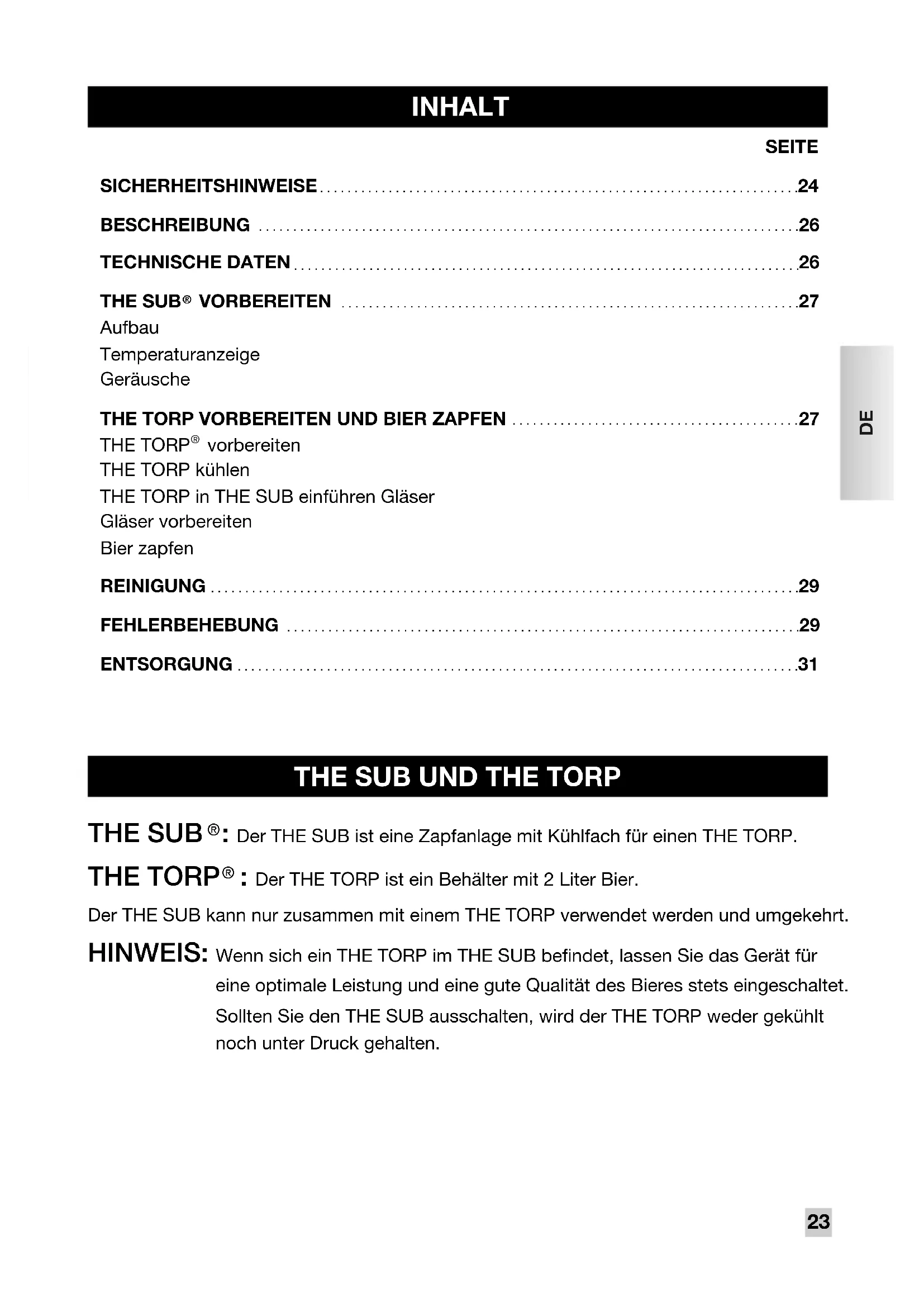 : Der THE TORP ist ein Behälter mit 2 Liter Bier. Der THE SUB kann nur zusammen mit einem THE TORP verwendet werden und umgekehrt. HINWEIS: Wenn sich ein THE TORP im THE SUB befindet, lassen Sie das Gerät für eine optimale Leistung und eine gute Qualität des Bieres stets eingeschaltet. Sollten Sie den THE SUB ausschalten, wird der THE TORP weder gekühlt noch unter Druck gehalten. INHALT