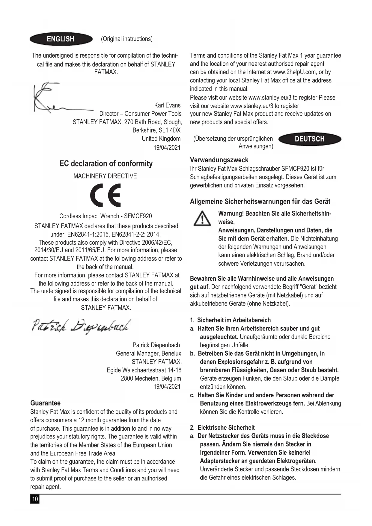 Cordless Impact Wrench - SFMCF920 STANLEY FATMAX declares that these products described under EN62841-1:2015, EN62841-2-2: 2014. These products also comply with Directive 2006/42/EC, 2014/30/EU and 2011/65/EU. For more information, please contact STANLEY FATMAX at the following address or refer to the back of the manual. For more information, please contact STANLEY FATMAX at the following address or refer to the back of the manual. The undersigned is responsible for compilation of the technical le and makes this declaration on behalf of STANLEY FATMAX. Patrick Diepenbach General Manager, Benelux STANLEY FATMAX, Egide Walschaertsstraat 14-18 2800 Mechelen, Belgium 19/04/2021 Guarantee Stanley Fat Max is confident of the quality of its products and offers consumers a 12 month guarantee from the date of purchase. This guarantee is in addition to and in no way prejudices your statutory rights. The guarantee is valid within the territories of the Member States of the European Union and the European Free Trade Area. To claim on the guarantee, the claim must be in accordance with Stanley Fat Max Terms and Conditions and you will need to submit proof of purchase to the seller or an authorised repair agent. Verwendungszweck Ihr Stanley Fat Max Schlagschrauber SFMCF920 ist für Schlagbefestigungsarbeiten ausgelegt. Dieses Gerät ist zum gewerblichen und privaten Einsatz vorgesehen. Allgemeine Sicherheitswarnungen für das Gerät Warnung! Beachten Sie alle Sicherheitshin- weise, Anweisungen, Darstellungen und Daten, die Sie mit dem Gerät erhalten. Die Nichteinhaltung der folgenden Warnungen und Anweisungen kann einen elektrischen Schlag, Brand und/oder schwere Verletzungen verursachen. Bewahren Sie alle Warnhinweise und alle Anweisungen gut auf. Der nachfolgend verwendete Begriff "Gerät" bezieht sich auf netzbetriebene Geräte (mit Netzkabel) und auf akkubetriebene Geräte (ohne Netzkabel).