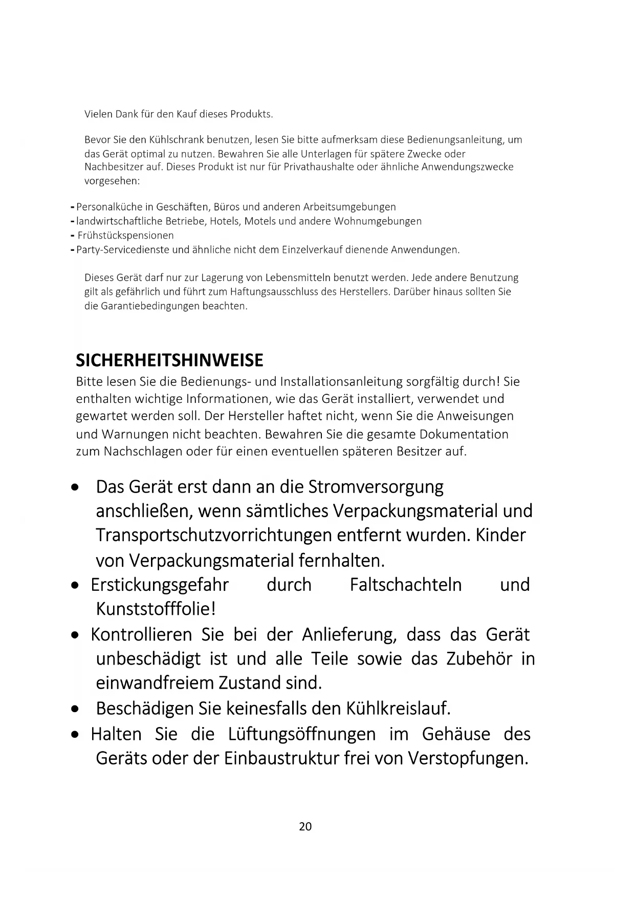 - Entfernen Sie die Tür Vielen Dank für den Kauf dieses Produkts. Bevor Sie den Kühlschrank benutzen, lesen Sie bitte aufmerksam diese Bedienungsanleitung, um das Gerät optimal zu nutzen. Bewahren Sie alle Unterlagen für spätere Zwecke oder Nachbesitzer auf. Dieses Produkt ist nur für Privathaushalte oder ähnliche Anwendungszwecke vorgesehen: - Personalküche in Geschäften, Büros und anderen Arbeitsumgebungen - landwirtschaftliche Betriebe, Hotels, Motels und andere Wohnumgebungen - Frühstückspensionen - Party-Servicedienste und ähnliche nicht dem Einzelverkauf dienende Anwendungen. Dieses Gerät darf nur zur Lagerung von Lebensmitteln benutzt werden. Jede andere Benutzung gilt als gefährlich und führt zum Haftungsausschluss des Herstellers. Darüber hinaus sollten Sie die Garantiebedingungen beachten. SICHERHEITSHINWEISE Bitte lesen Sie die Bedienungs- und Installationsanleitung sorgfältig durch! Sie enthalten wichtige Informationen, wie das Gerät installiert, verwendet und gewartet werden soll. Der Hersteller haftet nicht, wenn Sie die Anweisungen und Warnungen nicht beachten. Bewahren Sie die gesamte Dokumentation zum Nachschlagen oder für einen eventuellen späteren Besitzer auf. p. 3820