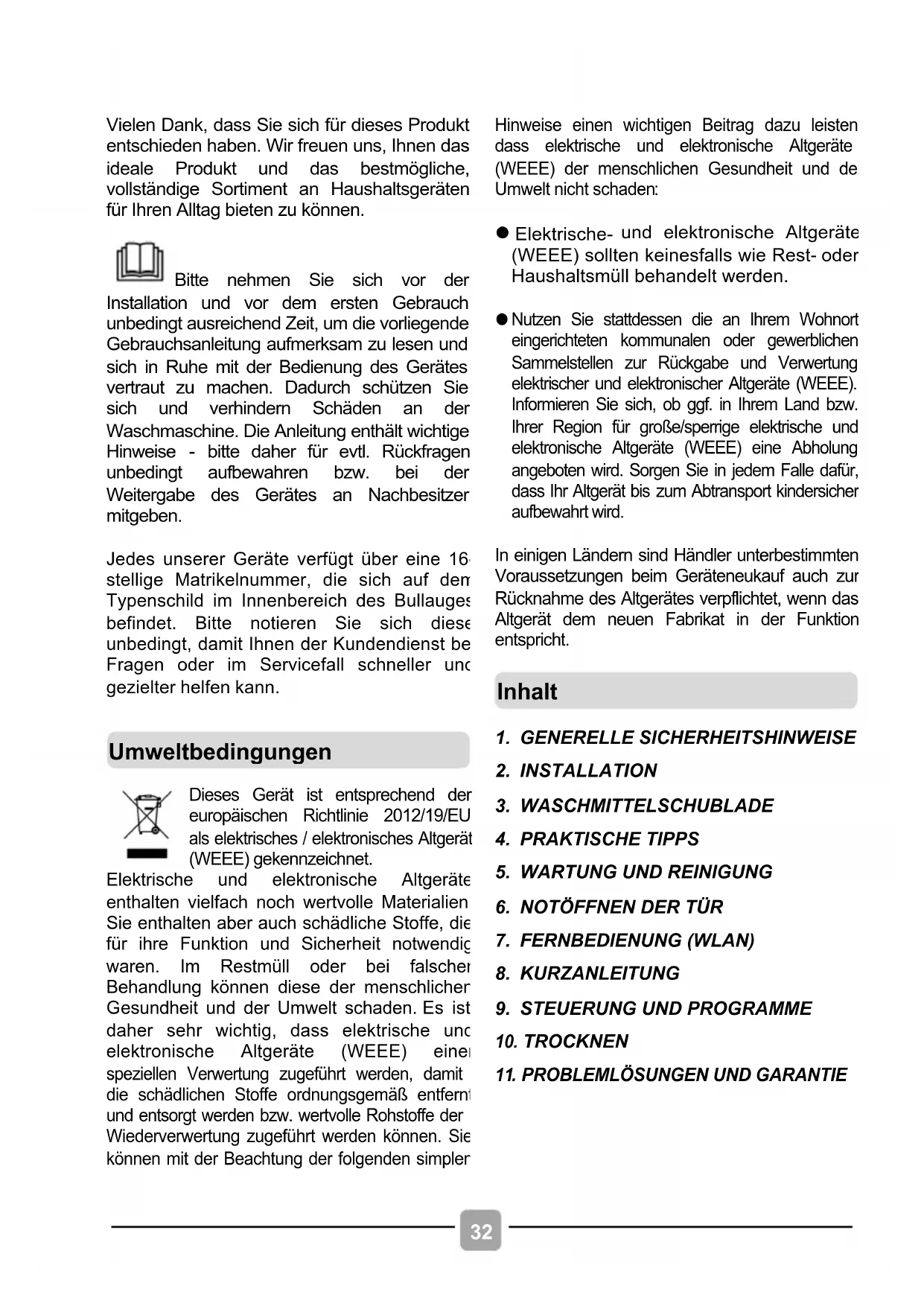 Bitte nehmen Sie sich vor der Installation und vor dem ersten Gebrauch unbedingt ausreichend Zeit, um die vorliegende Gebrauchsanleitung aufmerksam zu lesen und sich in Ruhe mit der Bedienung des Gerätes vertraut zu machen. Dadurch schützen Sie sich und verhindern Schäden an der Waschmaschine. Die Anleitung enthält wichtige Hinweise