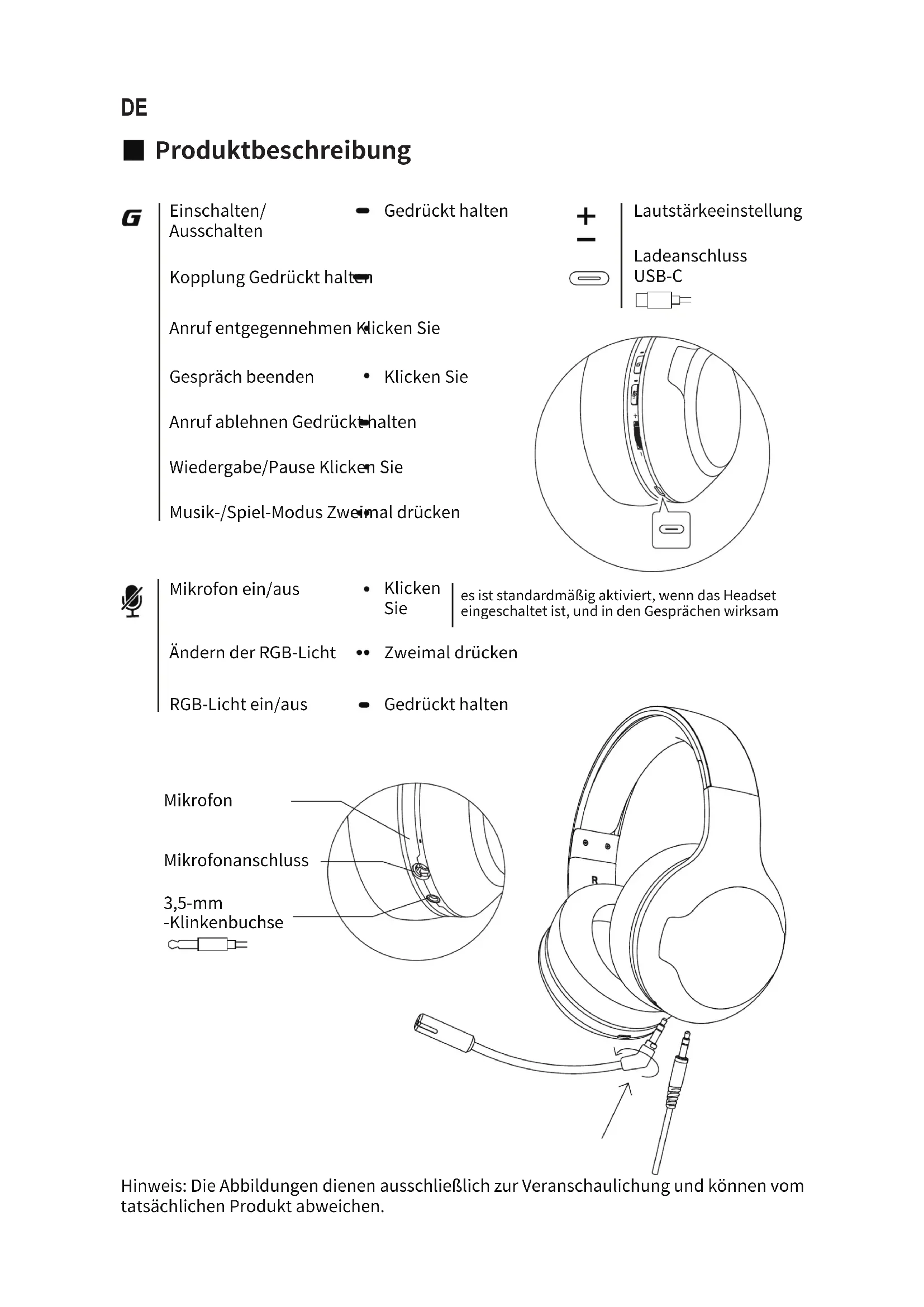 - Wenn das Headset ausgeschaltet ist, halten Sie die Taste „ “10 Sekunden lang gedrückt, bis das blaue Licht sechsmal schnell blinkt, dann wurden die Werkseinstellungen wiederhergestellt.Produkt zubehör Bedienungsanleitung 3,5-mm-Audiokabel Ladekabel MikrofonWartung