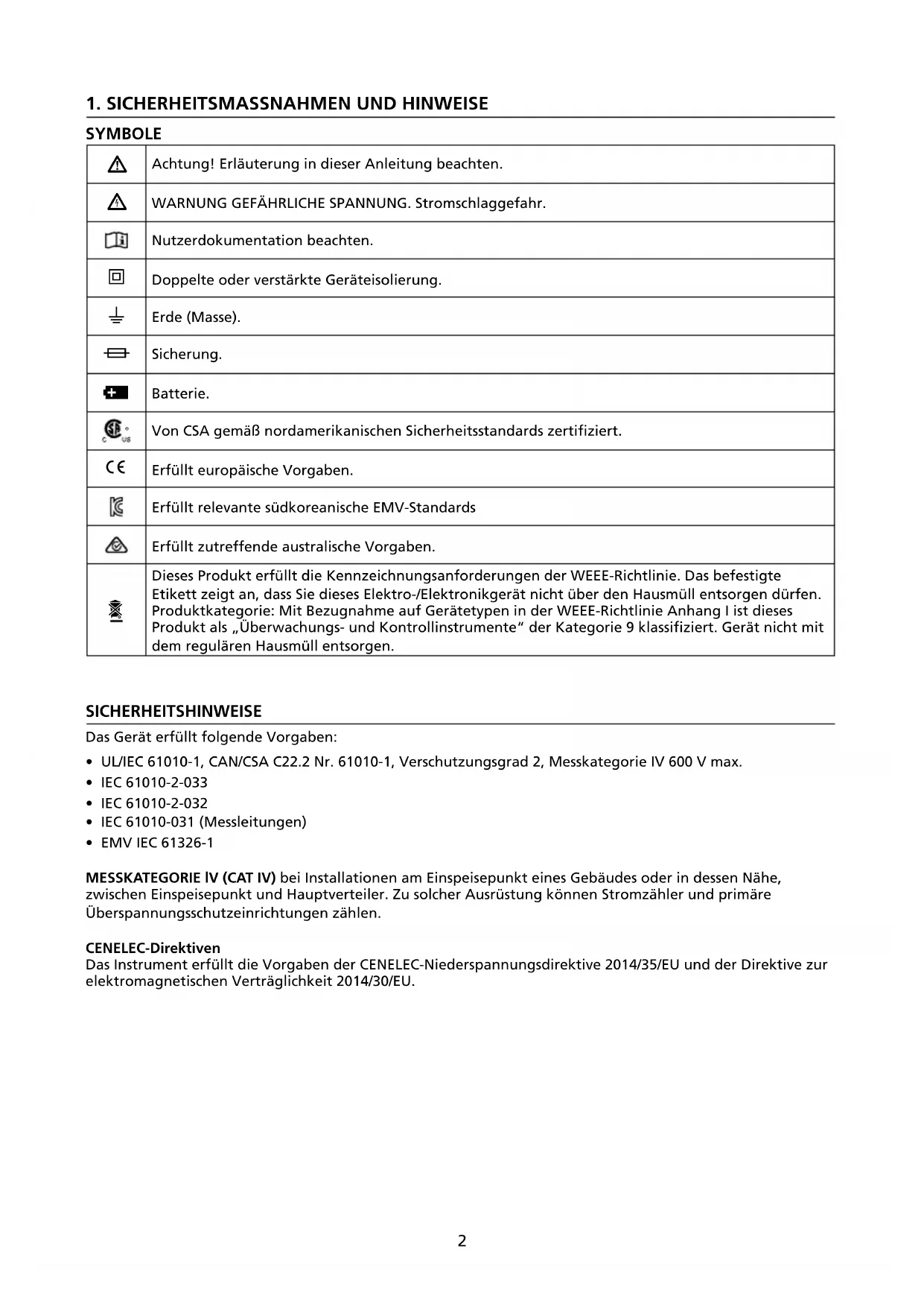 - EMV IEC 61326-1 MESSKATEGORIE lV (CAT IV) bei Installationen am Einspeisepunkt eines Gebäudes oder in dessen Nähe, zwischen Einspeisepunkt und Hauptverteiler. Zu solcher Ausrüstung können Stromzähler und primäre Überspannungsschutzeinrichtungen zählen. CENELEC-Direktiven Das Instrument erfüllt die Vorgaben der CENELEC-Niederspannungsdirektive 2014/35/EU und der Direktive zur elektromagnetischen Verträglichkeit 2014/30/EU.3 Warnungen: Vor Gebrauch lesen Damit es nach Möglichkeit nicht zu Stromschlägen und Verletzungen kommt: