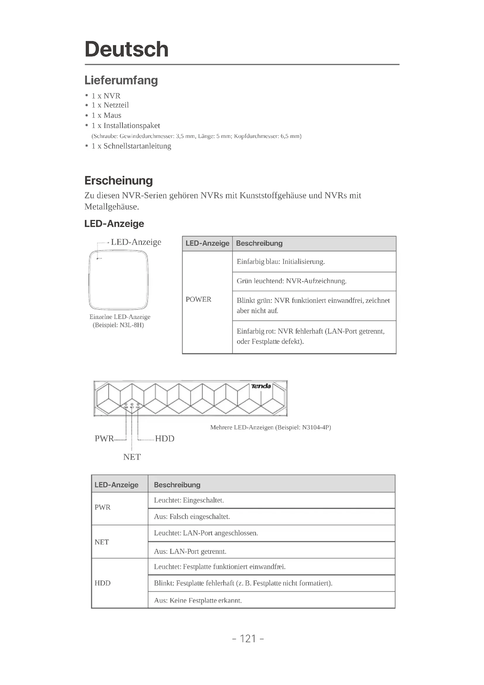 - Schalten Sie die Kamera aus und starten Sie sie neu. Frage 4. Was soll ich tun, wenn der NVR die Kamera nicht finden kann? Antwort 4: Wenn der NVR den PoE-Port unterstützt und die Kamera mit dem PoE-Port des NVR verbunden wurde, versuchen Sie die folgenden Lösungen: - Verbinden Sie den Computer und die Kamera mit demselben Netzwerk und aktivieren Sie die DHCP-Funk tion der Kamera (über das Client-Verwaltungstool, z. B. den ONVIF Device Manager oder die Web-Benutze roberfläche der Kamera zur Konfiguration). - Wenn es sich um die Kamera eines Drittanbieters handelt, stellen Sie sicher, dass die Kamera ONVIF unterstützt, ONVIF aktiviert ist und ein Administrator mit dem Benutzernamen admin zur Benutzerliste hinzugefügt wurde. Wenn die Kamera mit der LAN-Seite des NVR verbunden wurde, versuchen Sie die folgenden Lösungen: - Stellen Sie sicher, dass die Kamera ordnungsgemäß funktioniert, dass sie ordnungsgemäß am Switch oder Router angeschlossen ist, der wiederum mit dem NVR verbunden ist, und dass das Ethernet-Kabel fest sitzt. - Stellen Sie sicher, dass sich die IP-Adresse der Kamera im selben Netzwerksegment befindet wie die LAN-IP-Adresse des NVR (über ein Client-Verwaltungstool wie ONVIF Device Manager oder die Web-Benutzeroberfläche der Kamera zur Konfiguration). - Wenn es sich um die Kamera eines Drittanbieters handelt, stellen Sie sicher, dass die Kamera ONVIF unterstützt, ONVIF aktiviert ist und ein Administrator mit dem Benutzernamen admin zur Benutzerliste hinzugefügt wurde. Wenn das Problem weiterhin besteht, wenden Sie sich bitte an den technischen Support von Tenda.- 131 - Español Package contents Apariencia NVR x 1Adaptador de corriente x 1ratón x 1Paquete de instalación x 1 (Tornillo: diámetro de la rosca: 3,5 mm, longitud: 5 mm; diámetro de la cabeza: 6,5 mm)Guía de instalación rápida x 1 Indicadores LED Esta serie de NVR incluye NVR con carcasa de plástico y NVR con carcasa de metal.POWER LED indicator Indicador LED único (Ejemplo: N3L-8H)Múltiples indicadores LED (Ejemplo: N3104-4P) PWR NET HDD Indicadores LED Descripción POWER Azul sólido: inicializando. Verde fijo: grabación NVR. Verde intermitente: el NVR funciona correctamente pero no graba. Rojo sólido: NVR defectuoso (puerto LAN desconectado o HDD defectuoso). Indicadores LED Descripción PWR NET HDD Encendido, luz sólida: Encendido. Apagado: encendido incorrectamente. Encendido, luz sólida: Puerto LAN conectado. Apagado: puerto LAN desconectado. Encendido, luz sólida: HDD funcionando correctamente. Parpadeando: HDD defectuoso (por ejemplo, HDD no formateado). Apagado: No se detectó HDD.-132 - Panel inferior Orificio para tornillo de disco duroOrificio para tornillo de disco duro Agujeros de montaje en pared Agujeros de montaje en pared ConsejosOrificios de montaje en pared: se utilizan para fijar el dispositivo a la pared.Los materiales de montaje en pared son de preparación propia. Especificaciones recomendadas de los tornillos y anclajes de plástico:Tornillo: diámetro de la rosca: 3 mm, longitud: 14 mm; diámetro de la cabeza: 5.2 mmAnclaje de plástico: diámetro interior: 6,0 mm; longitud: 26,4 mm Carcasa de plástico NVR (Ejemplo: N3L-8H) NVR de carcasa metálica (Ejemplo: N3104-4P) Panel trasero Puerto de alimentación Terminal de puesta a tierra Terminal de puesta a tierra Puerto HDMI Puerto LAN de 10/100 Mbps Puerto VGA NVR PoE (Ejemplo: N3104-4P) Puerto USB2.0