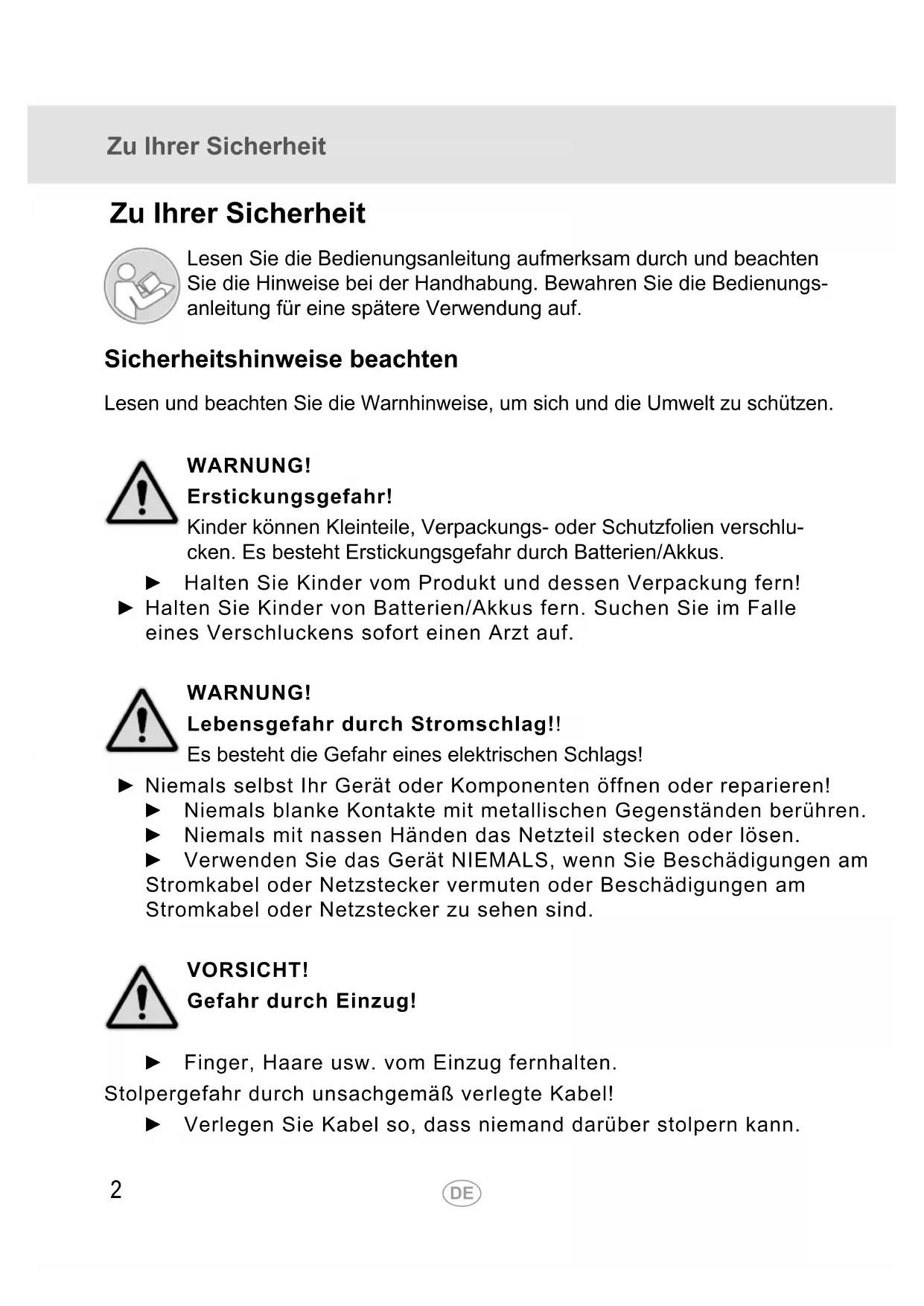 Zu Ihrer Sicherheit Lesen Sie die Bedienungsanleitung aufmerksam durch und beachten Sie die Hinweise bei der Handhabung. Bewahren Sie die Bedienungs- anleitung für eine spätere Verwendung auf. Sicherheitshinweise beachten Lesen und beachten Sie die Warnhinweise, um sich und die Umwelt zu schützen. WARNUNG! Erstickungsgefahr! Kinder können Kleinteile, Verpackungs- oder Schutzfolien verschlu- cken. Es besteht Erstickungsgefahr durch Batterien/Akkus. ► Halten Sie Kinder vom Produkt und dessen Verpackung fern! ► Halten Sie Kinder von Batterien/Akkus fern. Suchen Sie im Falle eines Verschluckens sofort einen Arzt auf. WARNUNG! Lebensgefahr durch Stromschlag!! Es besteht die Gefahr eines elektrischen Schlags! ► Niemals selbst Ihr Gerät oder Komponenten öffnen oder reparieren! ► Niemals blanke Kontakte mit metallischen Gegenständen berühren. ► Niemals mit nassen Händen das Netzteil stecken oder lösen. ► Verwenden Sie das Gerät NIEMALS, wenn Sie Beschädigungen am Stromkabel oder Netzstecker vermuten oder Beschädigungen am Stromkabel oder Netzstecker zu sehen sind. VORSICHT! Gefahr durch Einzug! ► Finger, Haare usw. vom Einzug fernhalten. Stolpergefahr durch unsachgemäß verlegte Kabel! ► Verlegen Sie Kabel so, dass niemand darüber stolpern kann.Zu Ihrer Sicherheit