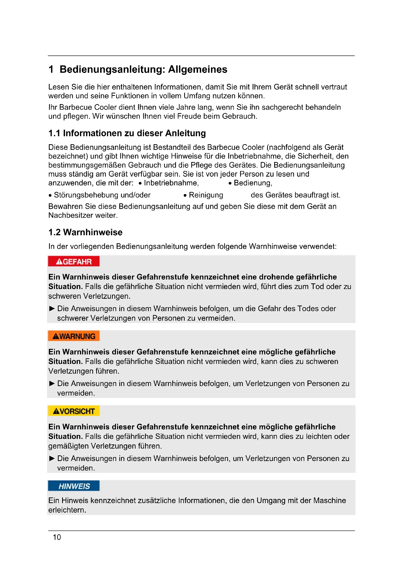 Diese Bedienungsanleitung ist Bestandteil des Barbecue Cooler (nachfolgend als Gerät bezeichnet) und gibt Ihnen wichtige Hinweise für die Inbetriebnahme, die Sicherheit, den bestimmungsgemäßen Gebrauch und die Pflege des Gerätes. Die Bedienungsanleitung muss ständig am Gerät verfügbar sein. Sie ist von jeder Person zu lesen und anzuwenden, die mit der: • Inbetriebnahme, • Bedienung,