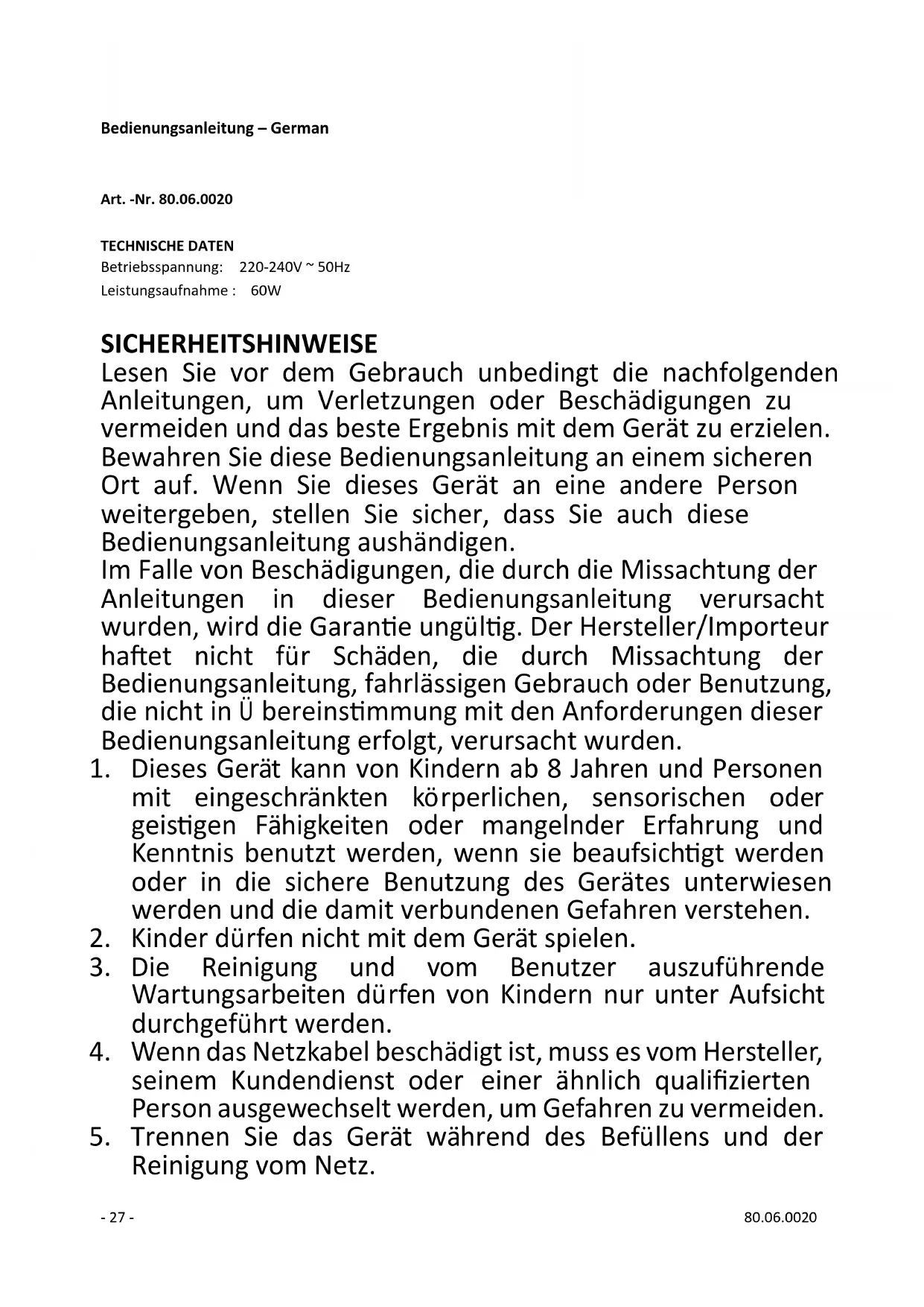 meters/sec Measurement standard for service value (EU) No 206/2012 + (EU) 2016/2282 EN ISO 5801: 2017 EN 50564: 2011 EN 60704-1:2010+A11:2012 EN 60704-2-7: 1998 Contact details for obtaining more information Hema BV PO Box 37110 1030 AC Amsterdam Netherlands Satisfies the requirement of the Council Directives: COMMISSION REGULATION (EU) No 206/2012 of 6 March 2012 and Amending COMMISSION REGULATION (EU) 2016/2282 implementing Directive 2009/125/EC of the European Parliament and of the Council with regard to ecodesign requirements for air conditioners and comfort fans Regarding information for consumers on how to install, use and maintain the product, WEEE information, please check the instruction manual provided with packaging.- 27 - 80.06.0020 Bedienungsanleitung – German Art. -Nr. 80.06.0020 TECHNISCHE DATEN Betriebsspannung: 220-240V ~ 50Hz Leistungsaufnahme : 60W SICHERHEITSHINWEISE Lesen Sie vor dem Gebrauch unbedingt die nachfolgenden Anleitungen, um Verletzungen oder Beschädigungen zu vermeiden und das beste Ergebnis mit dem Gerät zu erzielen. Bewahren Sie diese Bedienungsanleitung an einem sicheren Ort auf. Wenn Sie dieses Gerät an eine andere Person weitergeben, stellen Sie sicher, dass Sie auch diese Bedienungsanleitung aushändigen. Im Falle von Beschädigungen, die durch die Missachtung der Anleitungen in dieser Bedienungsanleitung verursacht wurden, wird die Garantie ungültig. Der Hersteller/Importeur haftet nicht für Schäden, die durch Missachtung der Bedienungsanleitung, fahrlässigen Gebrauch oder Benutzung, die nicht in Übereinstimmung mit den Anforderungen dieser Bedienungsanleitung erfolgt, verursacht wurden.
