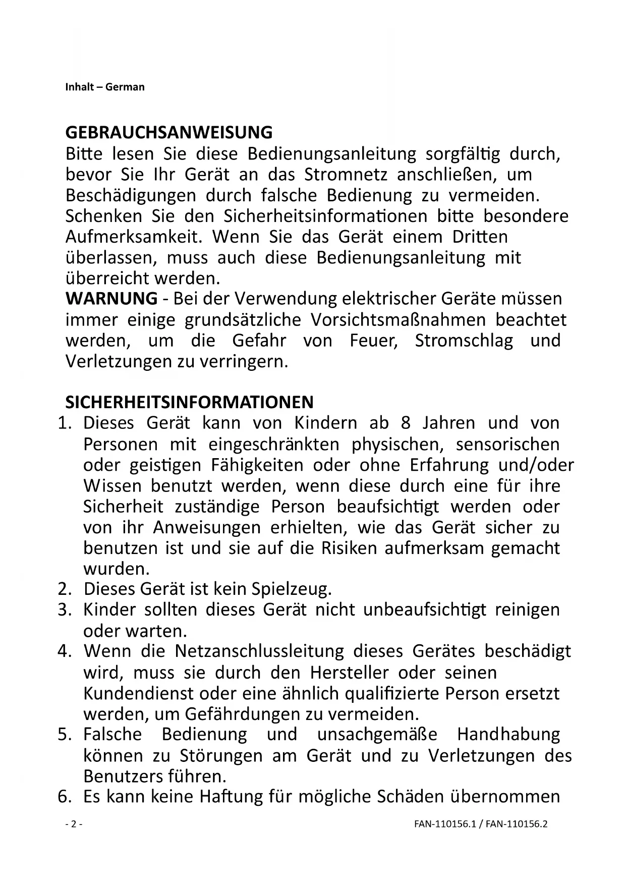 19. Benutzen Sie das Gerät niemals solange die Schutzgitter- 4 - FAN-110156.1 / FAN-110156.2