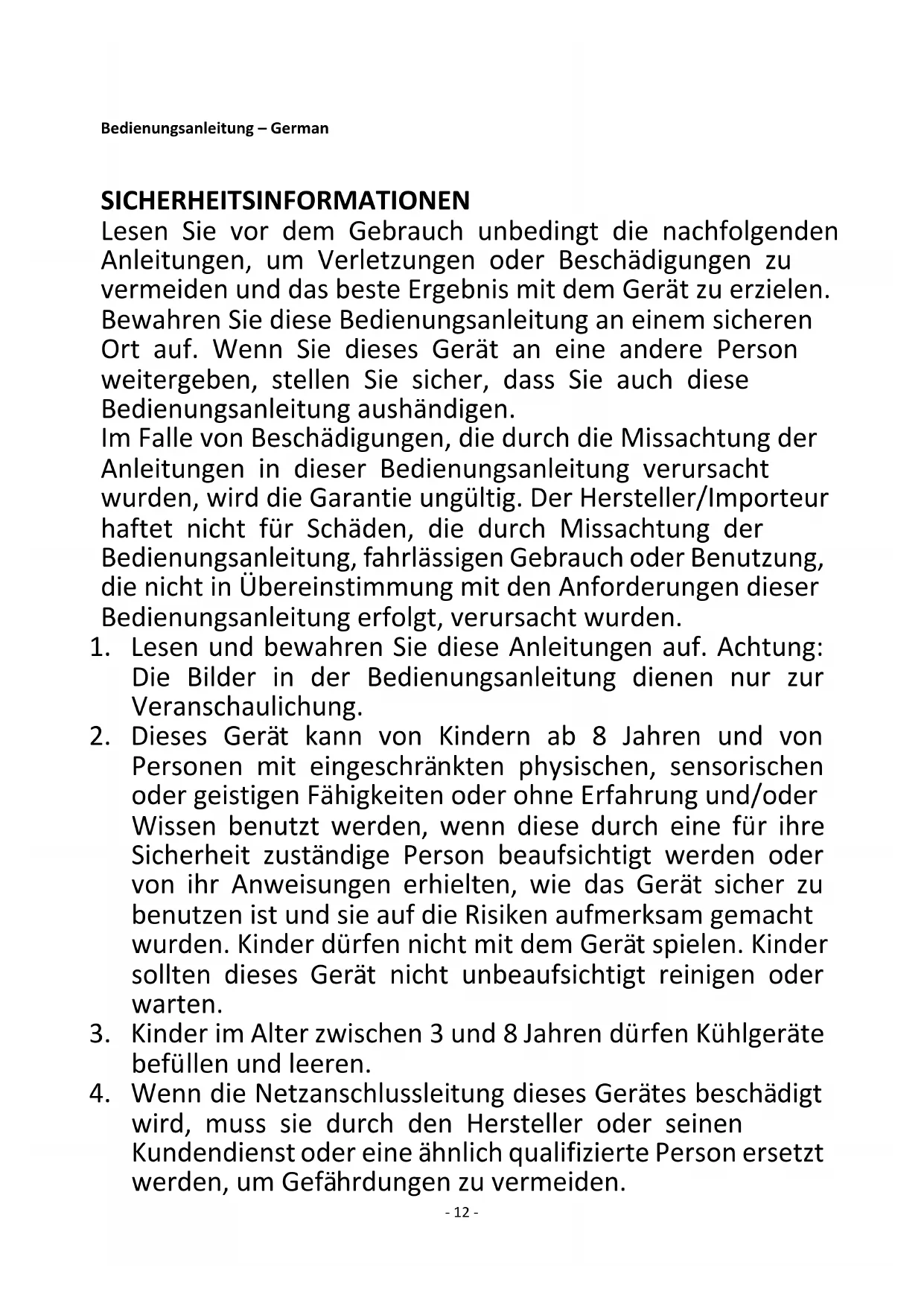 Recycling – European Directive 2012/19/EU This marking indicates that this product should not be disposed with other household wastes. To prevent possible harm to the environment or human health from uncontrolled waste disposal, recycle it responsibly to promote the sustainable reuse of material resources. To return your used device, please use the return and collection systems or contact the retailer where the product was purchased. They can take this product for environmental safe recycling. For professional repair and ordering spare parts, please contact our customer service. Emerio Deutschland GmbH (no service address) Lerchenweg 3 40789 Monheim am Rhein Deutschland Customer service: T: +49 (0) 3222 1097 600 E: info.de@emerio.eu- 12 - Bedienungsanleitung – German SICHERHEITSINFORMATIONEN Lesen Sie vor dem Gebrauch unbedingt die nachfolgenden Anleitungen, um Verletzungen oder Beschädigungen zu vermeiden und das beste Ergebnis mit dem Gerät zu erzielen. Bewahren Sie diese Bedienungsanleitung an einem sicheren Ort auf. Wenn Sie dieses Gerät an eine andere Person weitergeben, stellen Sie sicher, dass Sie auch diese Bedienungsanleitung aushändigen. Im Falle von Beschädigungen, die durch die Missachtung der Anleitungen in dieser Bedienungsanleitung verursacht wurden, wird die Garantie ungültig. Der Hersteller/Importeur haftet nicht für Schäden, die durch Missachtung der Bedienungsanleitung, fahrlässigen Gebrauch oder Benutzung, die nicht in Übereinstimmung mit den Anforderungen dieser Bedienungsanleitung erfolgt, verursacht wurden.