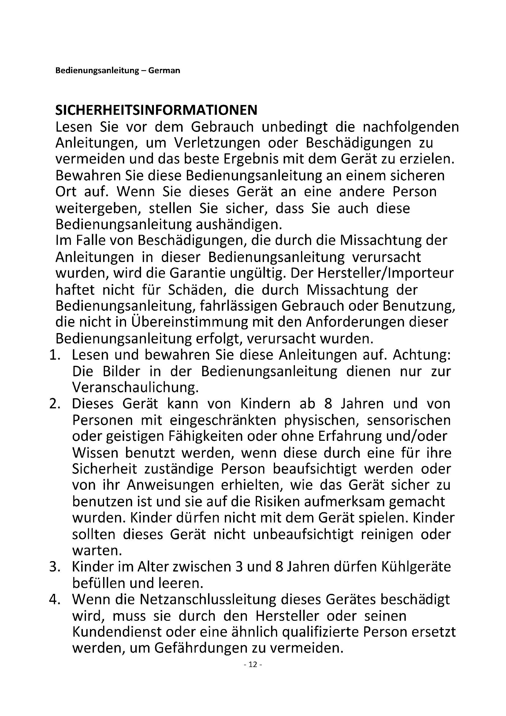 Emerio B.V. Zomervaart 1A 2033 DA Haarlem The Netherlands Customer service: T: +31(0)23 3034369 E: info.nl@emerio.eu- 12 - Bedienungsanleitung – German SICHERHEITSINFORMATIONEN Lesen Sie vor dem Gebrauch unbedingt die nachfolgenden Anleitungen, um Verletzungen oder Beschädigungen zu vermeiden und das beste Ergebnis mit dem Gerät zu erzielen. Bewahren Sie diese Bedienungsanleitung an einem sicheren Ort auf. Wenn Sie dieses Gerät an eine andere Person weitergeben, stellen Sie sicher, dass Sie auch diese Bedienungsanleitung aushändigen. Im Falle von Beschädigungen, die durch die Missachtung der Anleitungen in dieser Bedienungsanleitung verursacht wurden, wird die Garantie ungültig. Der Hersteller/Importeur haftet nicht für Schäden, die durch Missachtung der Bedienungsanleitung, fahrlässigen Gebrauch oder Benutzung, die nicht in Übereinstimmung mit den Anforderungen dieser Bedienungsanleitung erfolgt, verursacht wurden.