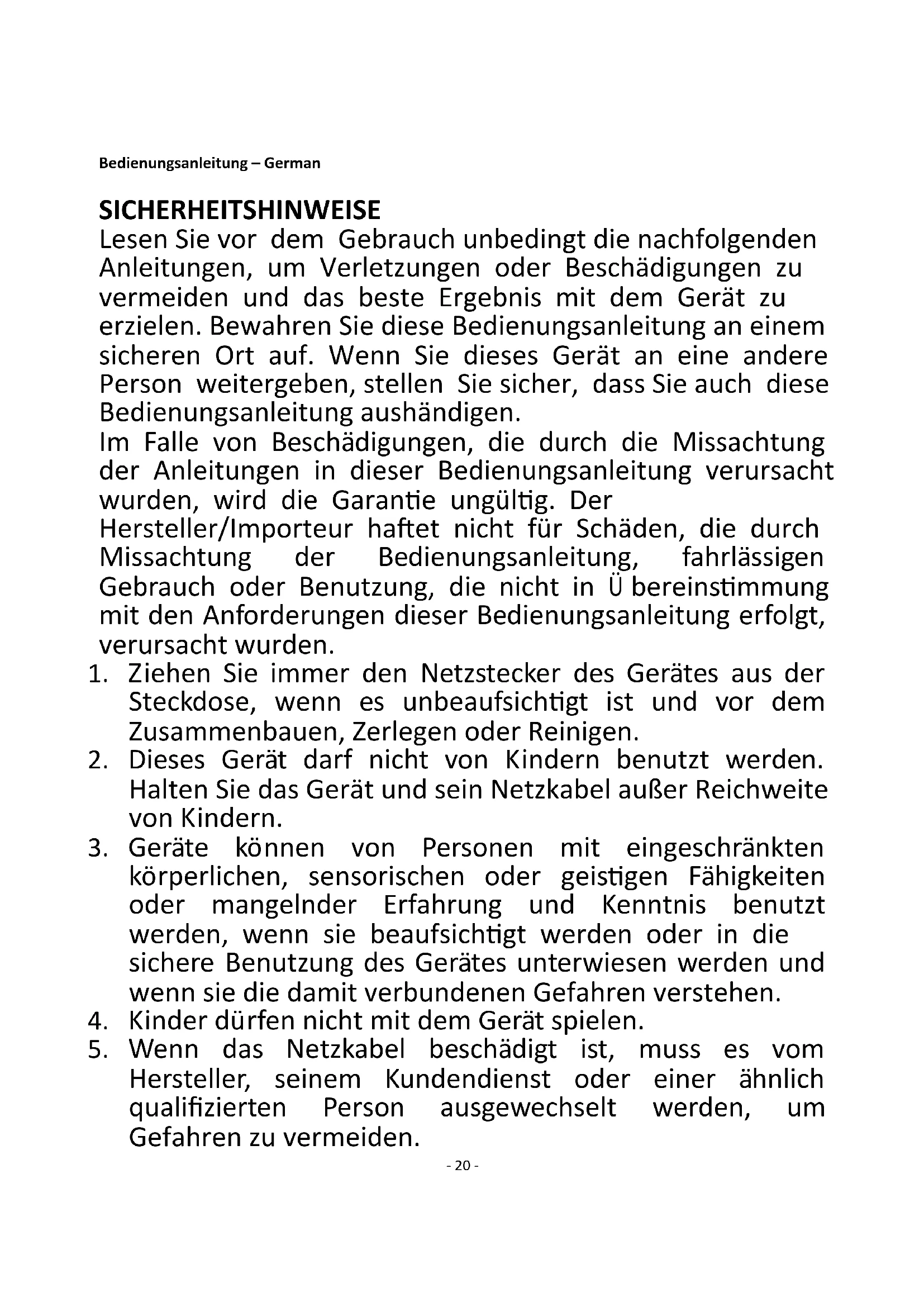 20. Verwenden Sie das Gerät nur zu seinem