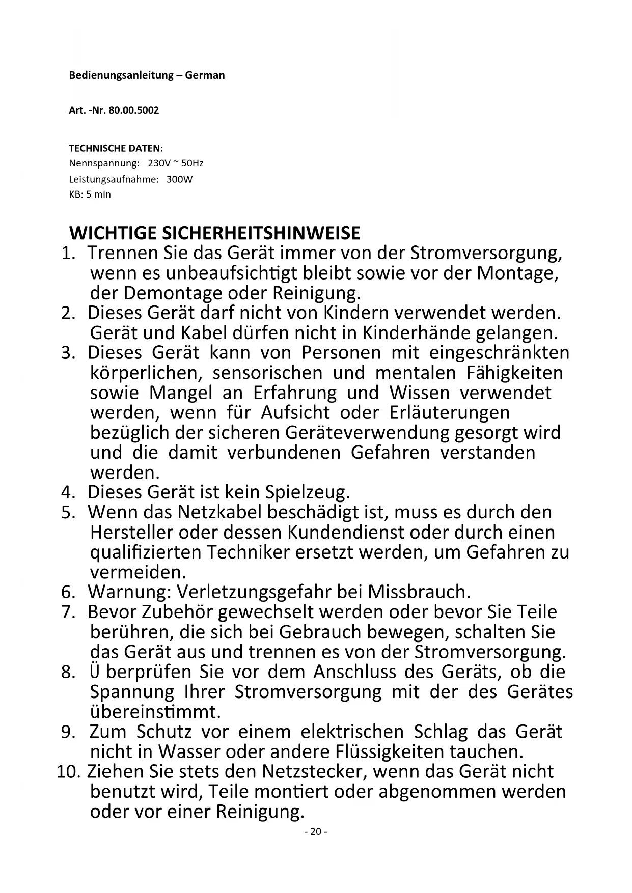 20. Das Gerät darf nicht mit Hilfe einer externen
