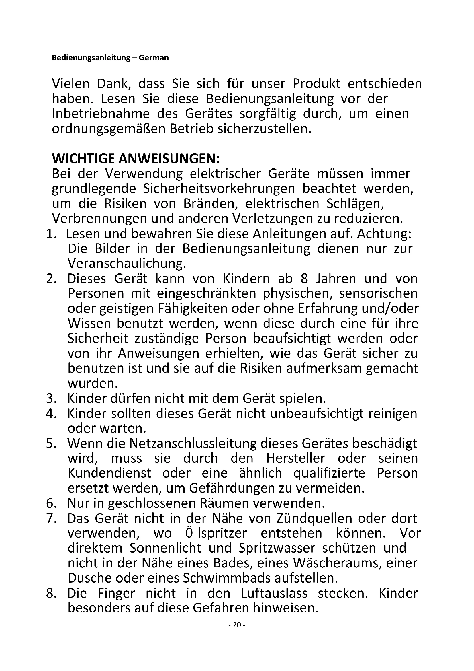 1. Lesen und bewahren Sie diese Anleitungen auf. Achtung:
