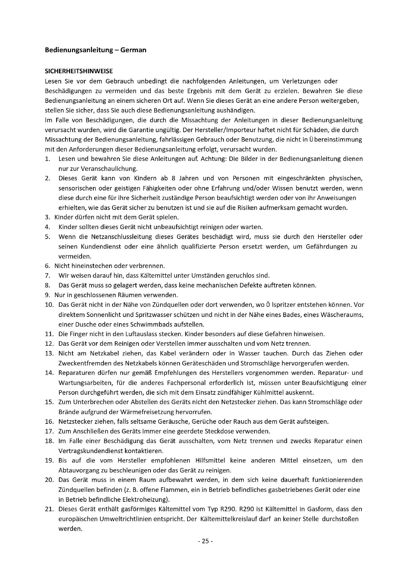 21. Dieses Gerät enthält gasförmiges Kältemittel vom Typ R290. R290 ist Kältemittel in Gasform, dass den