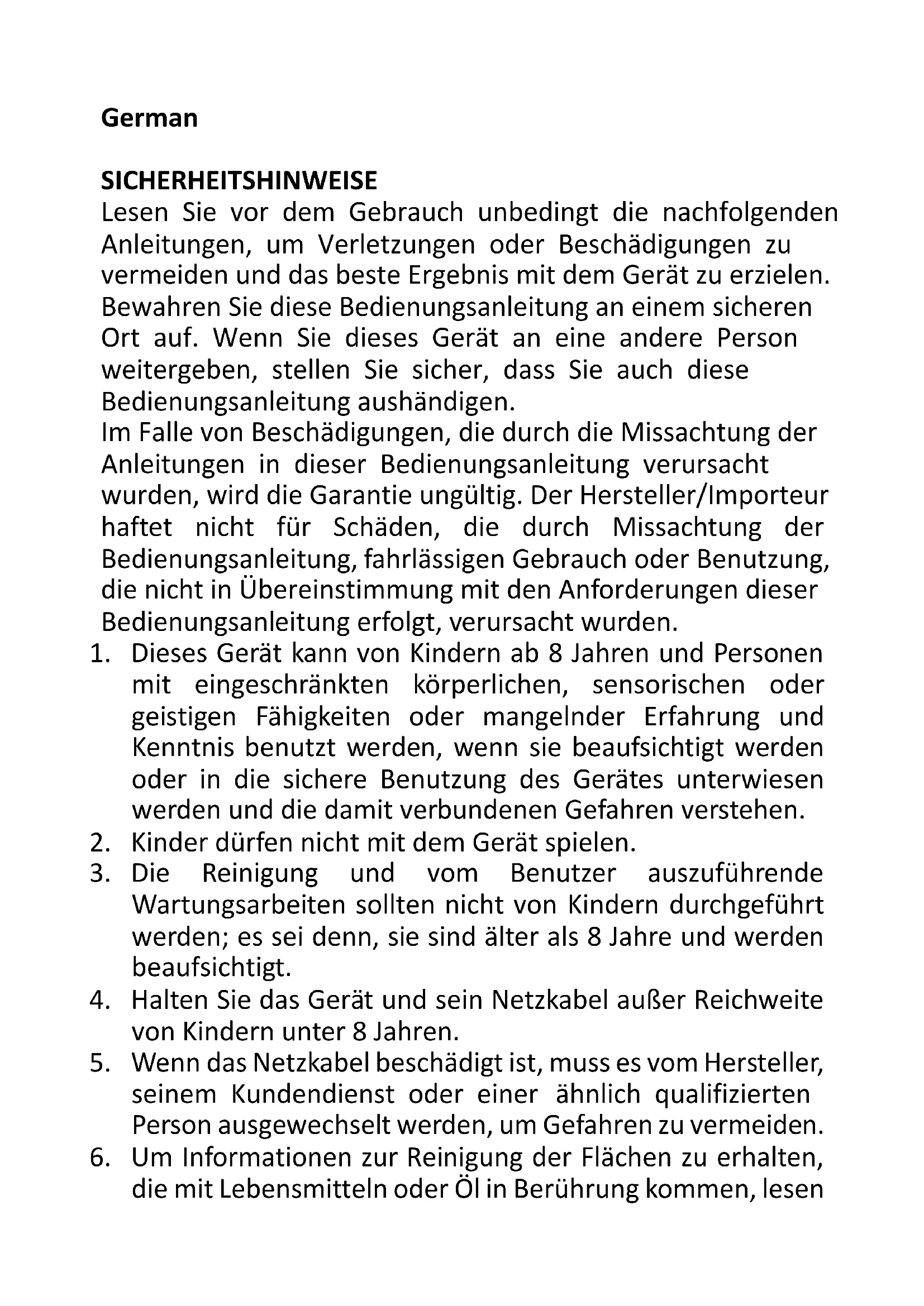 WARNING!! Please do not touch surface while in use. The temperature of accessible surfaces may be high when the appliance is operating.German SICHERHEITSHINWEISE Lesen Sie vor dem Gebrauch unbedingt die nachfolgenden Anleitungen, um Verletzungen oder Beschädigungen zu vermeiden und das beste Ergebnis mit dem Gerät zu erzielen. Bewahren Sie diese Bedienungsanleitung an einem sicheren Ort auf. Wenn Sie dieses Gerät an eine andere Person weitergeben, stellen Sie sicher, dass Sie auch diese Bedienungsanleitung aushändigen. Im Falle von Beschädigungen, die durch die Missachtung der Anleitungen in dieser Bedienungsanleitung verursacht wurden, wird die Garantie ungültig. Der Hersteller/Importeur haftet nicht für Schäden, die durch Missachtung der Bedienungsanleitung, fahrlässigen Gebrauch oder Benutzung, die nicht in Übereinstimmung mit den Anforderungen dieser Bedienungsanleitung erfolgt, verursacht wurden.