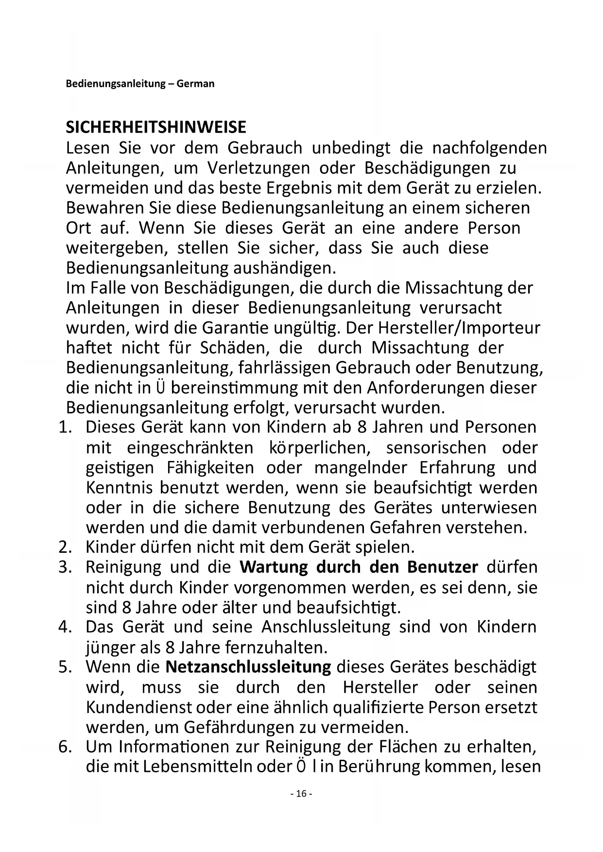 18. Dieses Gerät ist nicht für den gewerblichen Gebrauch