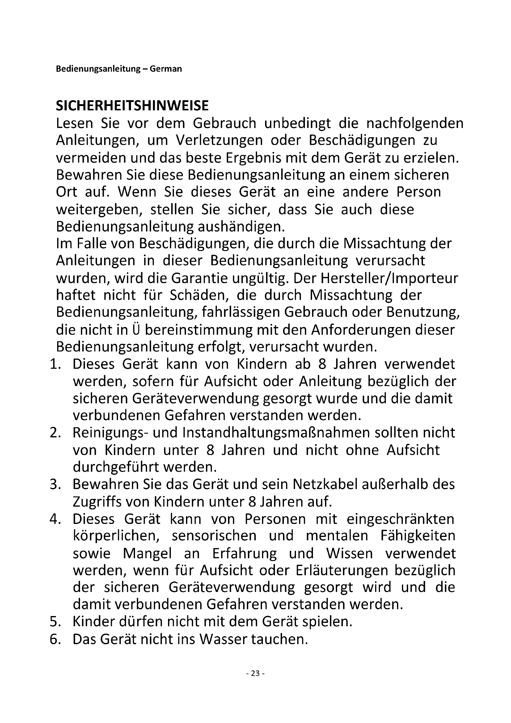 Återvinning - EU-direktiv 2012/19/EU Denna markering indikerar att produkten inte får kastas tillsammans med övrigt hushållsavfall. För att förhindra eventuell skada på miljön eller människors hälsa på grund av okontrollerad avfallshantering, återvinns de på ett ansvarsfullt sätt som främjar en hållbar återanvändning av materiella resurser. För att återlämna den använda enheten, använd retur- och insamlingssystem eller kontakta återförsäljaren där produkten var köpt. De kan ta denna produkt för miljösäker återvinning. Fun Nordic ApS Egelund 8 6200 Aabenraa Denmark www.funnordic.dk- 23 - Bedienungsanleitung – German SICHERHEITSHINWEISE Lesen Sie vor dem Gebrauch unbedingt die nachfolgenden Anleitungen, um Verletzungen oder Beschädigungen zu vermeiden und das beste Ergebnis mit dem Gerät zu erzielen. Bewahren Sie diese Bedienungsanleitung an einem sicheren Ort auf. Wenn Sie dieses Gerät an eine andere Person weitergeben, stellen Sie sicher, dass Sie auch diese Bedienungsanleitung aushändigen. Im Falle von Beschädigungen, die durch die Missachtung der Anleitungen in dieser Bedienungsanleitung verursacht wurden, wird die Garantie ungültig. Der Hersteller/Importeur haftet nicht für Schäden, die durch Missachtung der Bedienungsanleitung, fahrlässigen Gebrauch oder Benutzung, die nicht in Übereinstimmung mit den Anforderungen dieser Bedienungsanleitung erfolgt, verursacht wurden.