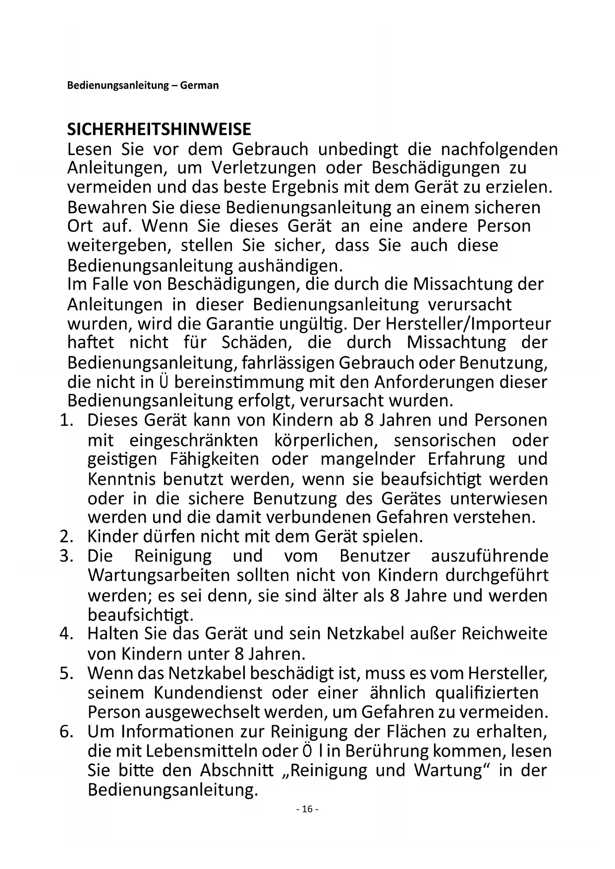 18. Dieses Gerät ist nicht für den gewerblichen Gebrauch