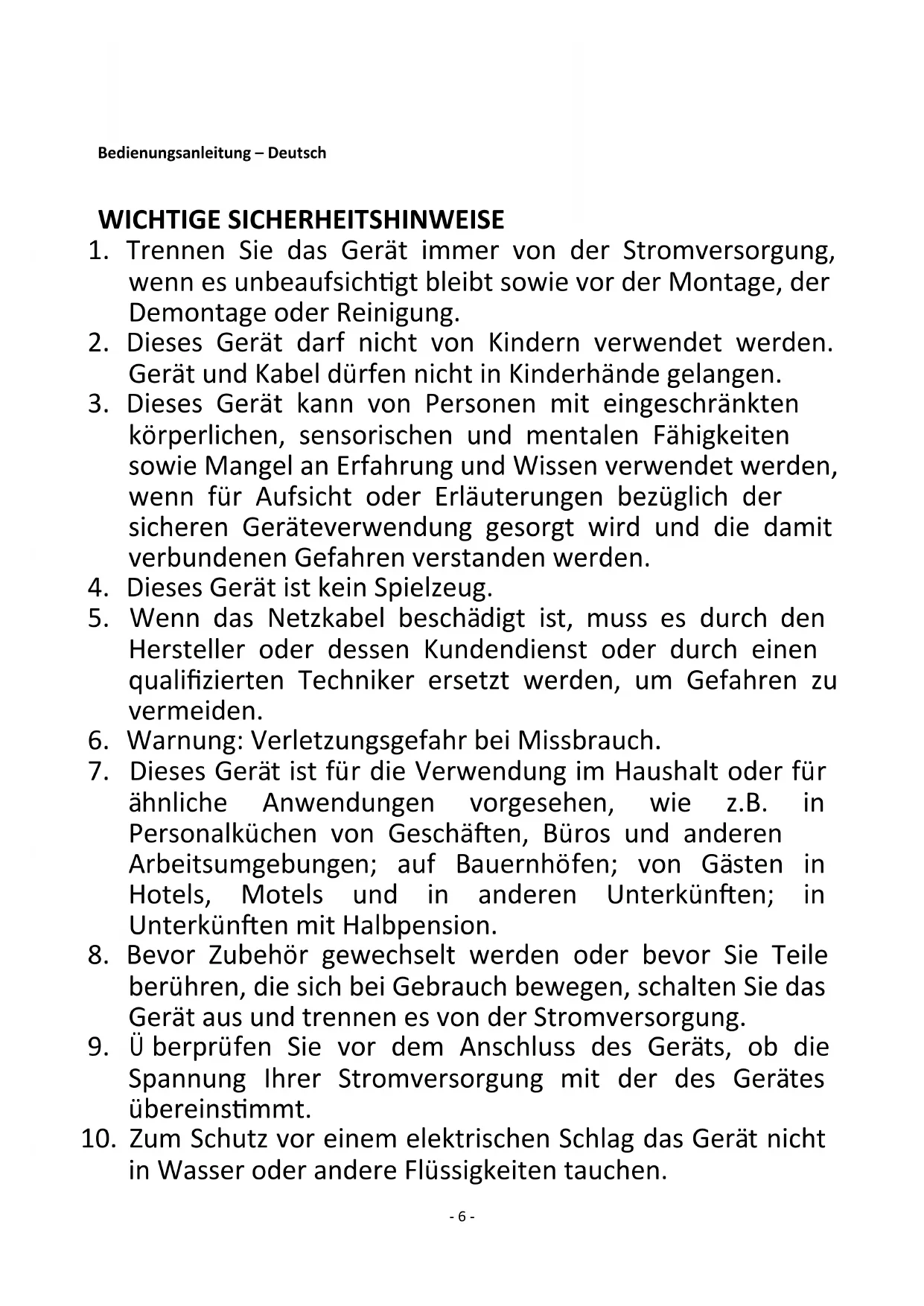 7. Dieses Gerät ist für die Verwendung im Haushalt oder für