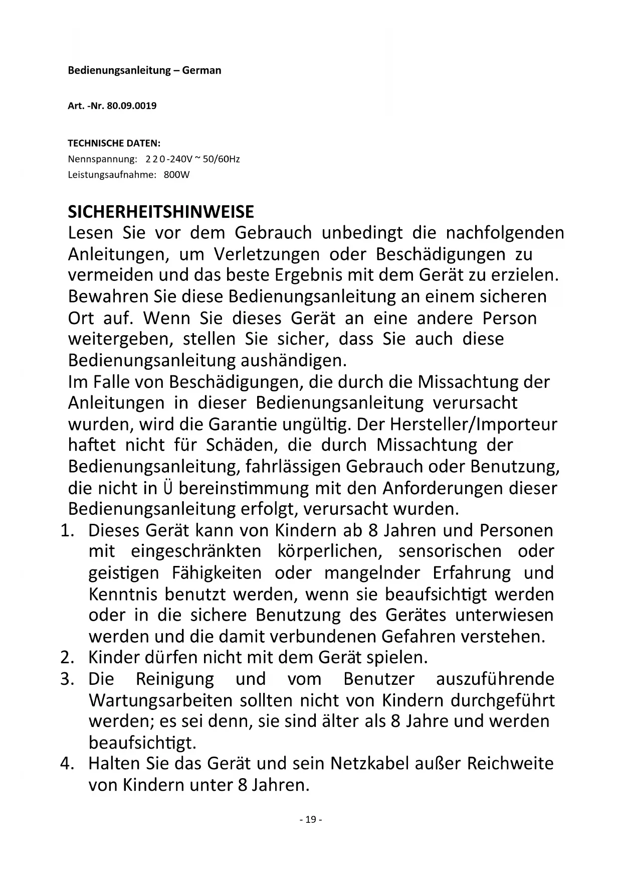 18. Dieses Gerät ist nicht für den gewerblichen Gebrauch