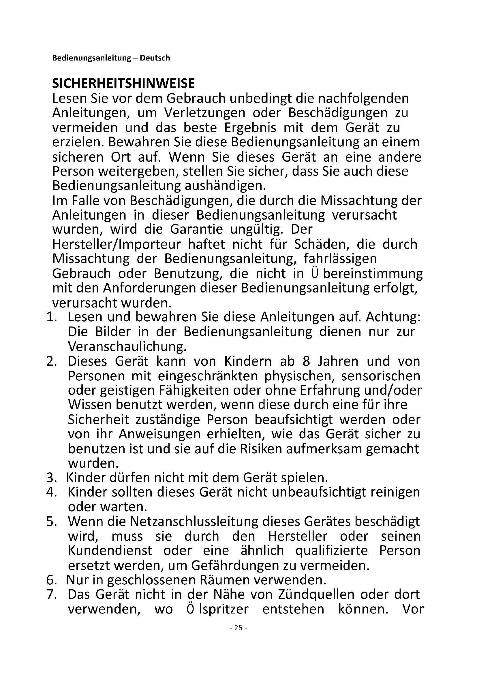 1. Lesen und bewahren Sie diese Anleitungen auf. Achtung: