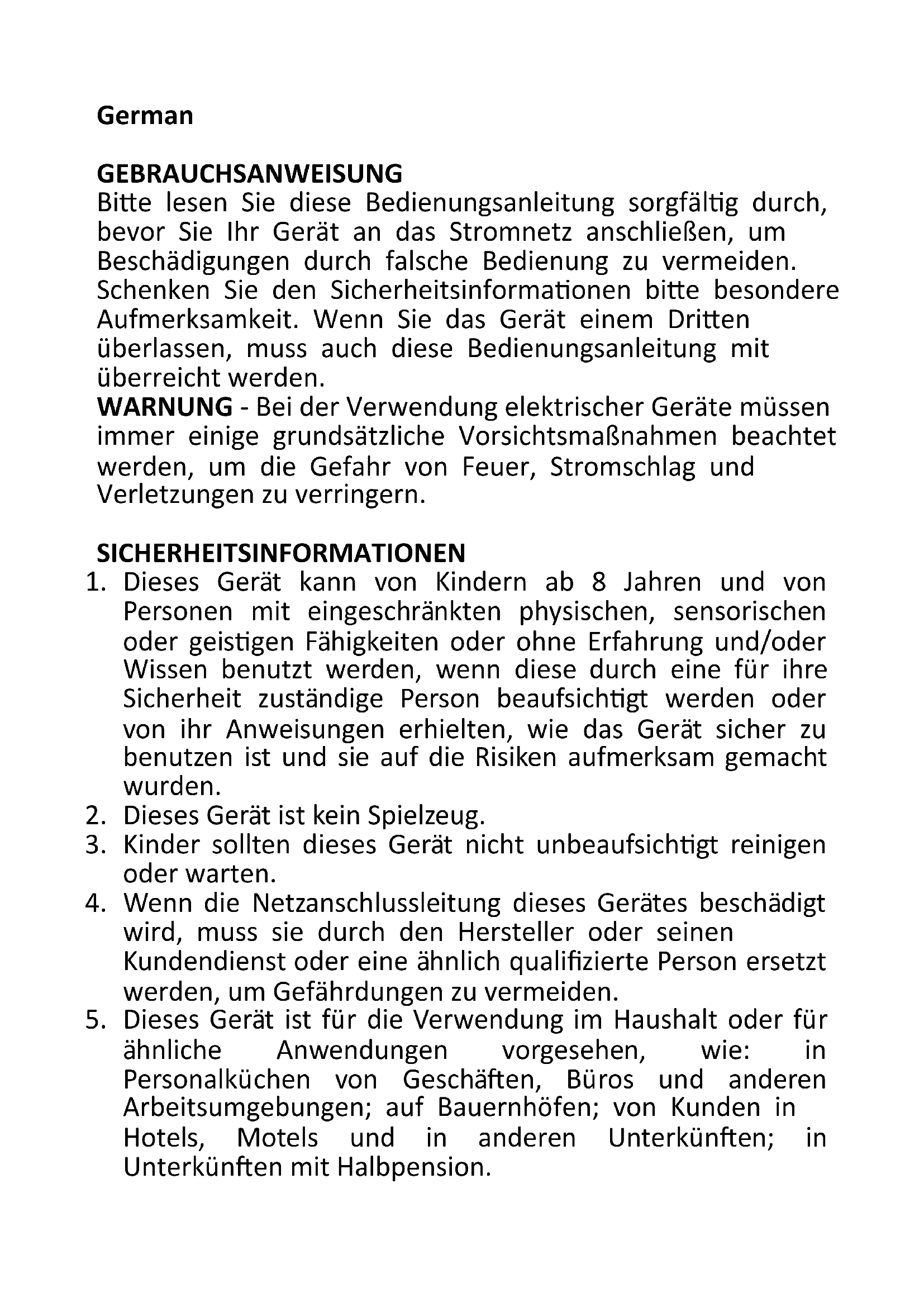 German GEBRAUCHSANWEISUNG Bitte lesen Sie diese Bedienungsanleitung sorgfältig durch, bevor Sie Ihr Gerät an das Stromnetz anschließen, um Beschädigungen durch falsche Bedienung zu vermeiden. Schenken Sie den Sicherheitsinformationen bitte besondere Aufmerksamkeit. Wenn Sie das Gerät einem Dritten überlassen, muss auch diese Bedienungsanleitung mit überreicht werden. WARNUNG - Bei der Verwendung elektrischer Geräte müssen immer einige grundsätzliche Vorsichtsmaßnahmen beachtet werden, um die Gefahr von Feuer, Stromschlag und Verletzungen zu verringern. SICHERHEITSINFORMATIONEN