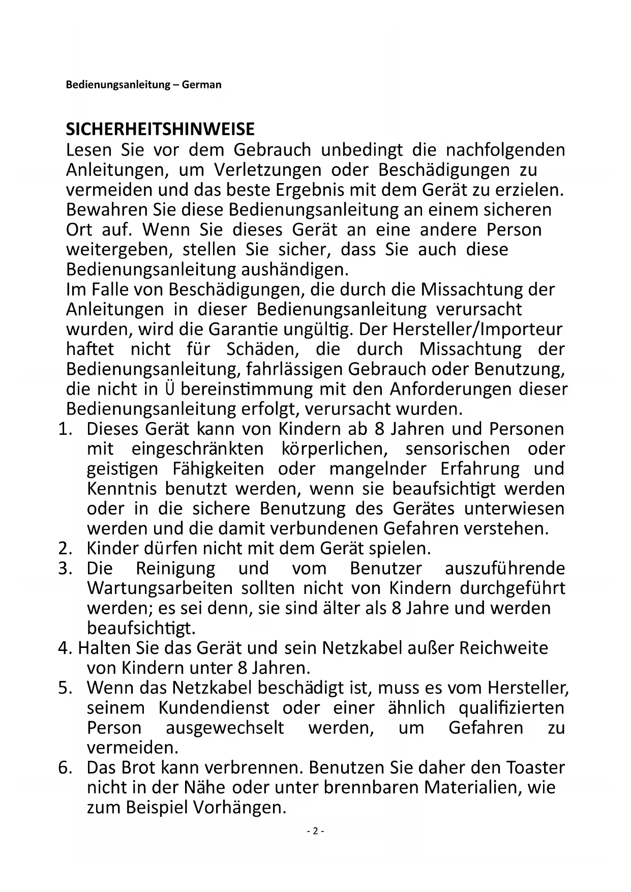 TO-121340.3 Toaster (DE) Grille-pain (FR) Toaster (CZ) Toaster (EN)- 1 - Inhalt – Teneur – Obsah – Content Bedienungsanleitung – German ................................................................................... - 2 - Mode d'emploi – French .............................................................................................. - 7 - Návod k použití - Czech .............................................................................................. - 12 - Instruction manual – English ...................................................................................... - 17 -- 2 - Bedienungsanleitung – German SICHERHEITSHINWEISE Lesen Sie vor dem Gebrauch unbedingt die nachfolgenden Anleitungen, um Verletzungen oder Beschädigungen zu vermeiden und das beste Ergebnis mit dem Gerät zu erzielen. Bewahren Sie diese Bedienungsanleitung an einem sicheren Ort auf. Wenn Sie dieses Gerät an eine andere Person weitergeben, stellen Sie sicher, dass Sie auch diese Bedienungsanleitung aushändigen. Im Falle von Beschädigungen, die durch die Missachtung der Anleitungen in dieser Bedienungsanleitung verursacht wurden, wird die Garantie ungültig. Der Hersteller/Importeur haftet nicht für Schäden, die durch Missachtung der Bedienungsanleitung, fahrlässigen Gebrauch oder Benutzung, die nicht in Übereinstimmung mit den Anforderungen dieser Bedienungsanleitung erfolgt, verursacht wurden.