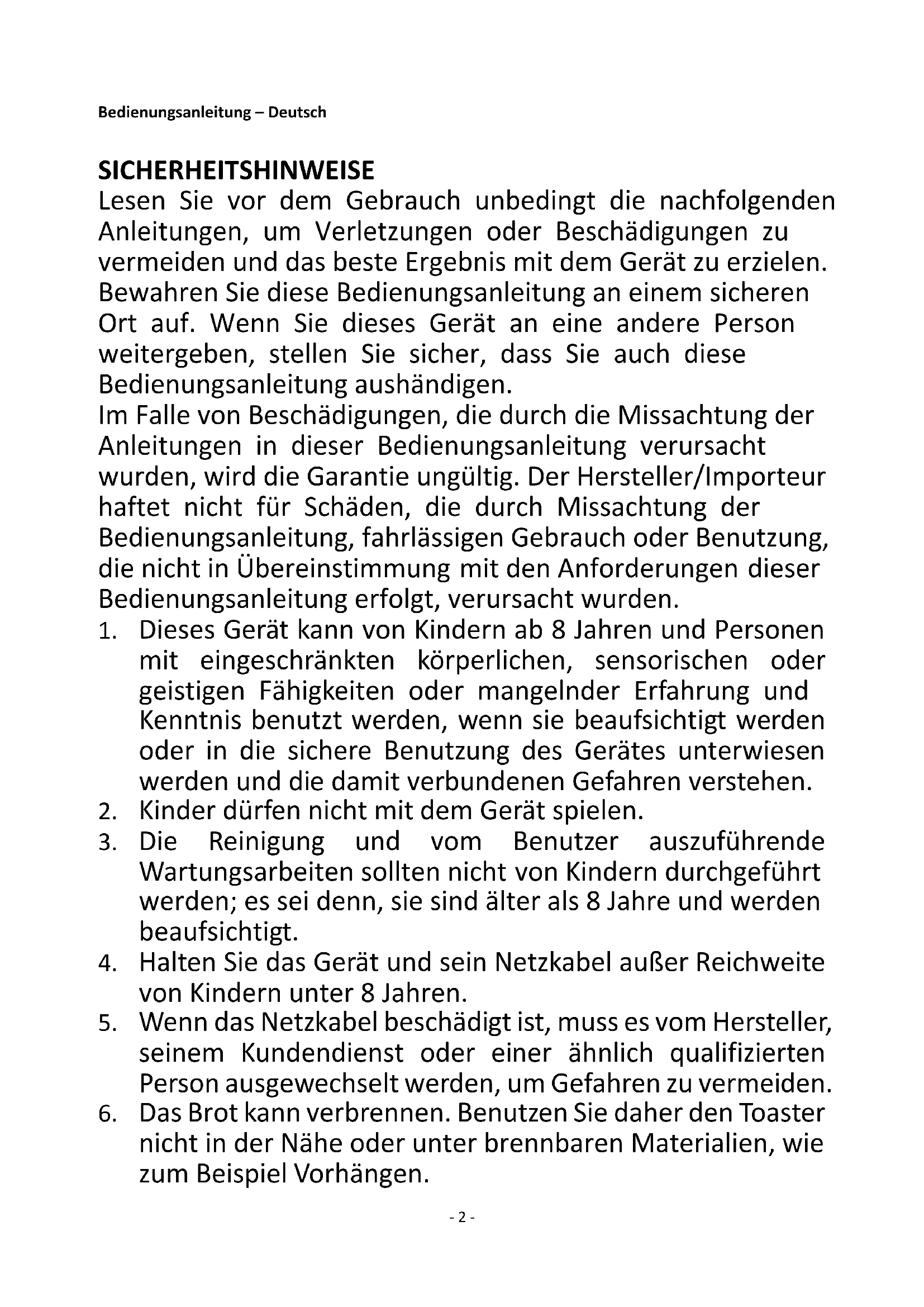 weichen Tuch nach. Tauchen Sie den Toaster zur Reinigung nie unter Wasser!- 6 -