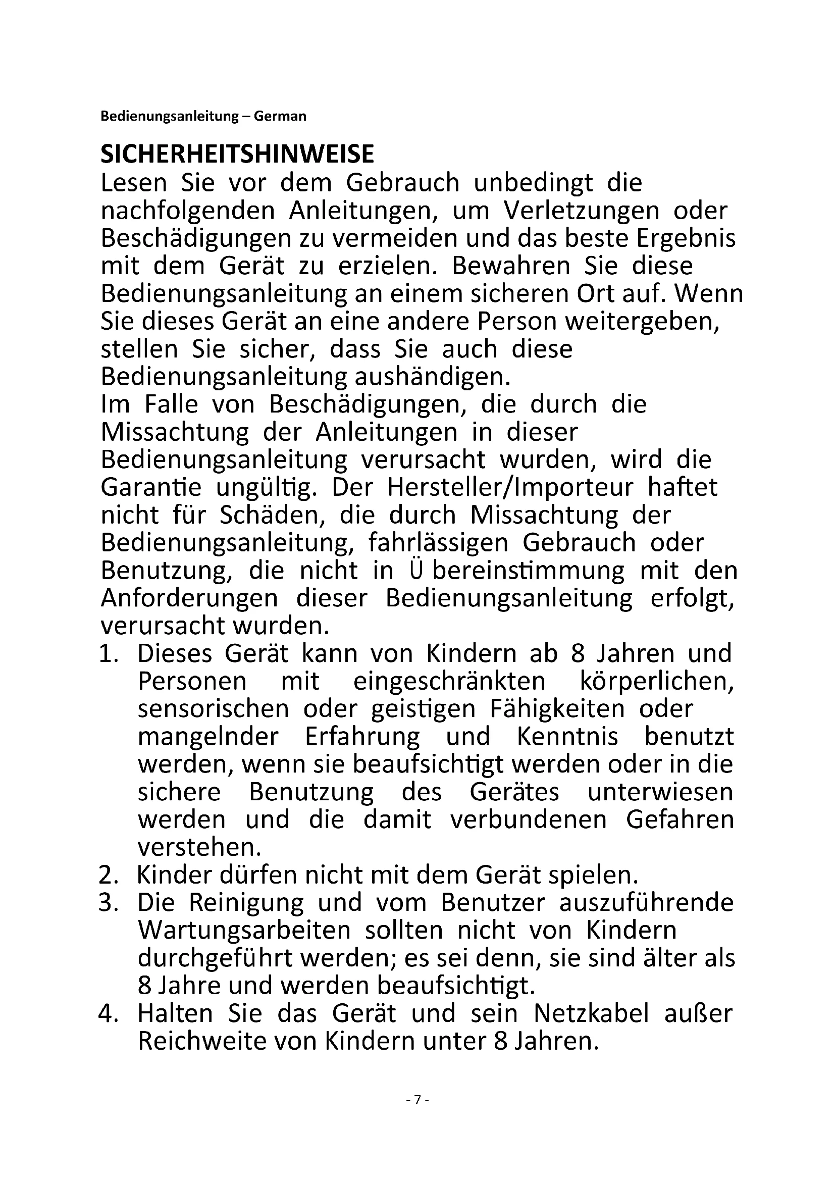 Recycling – European Directive 2012/19/EU This marking indicates that this product should not be disposed with other household wastes. To prevent possible harm to the environment or human health from uncontrolled waste disposal, recycle it responsibly to promote the sustainable reuse of material resources. To return your used device, please use the return and collection systems or contact the retailer where the product was purchased. They can take this product for environmental safe recycling. Emerio Deutschland GmbH (no service address) Lerchenweg 3 40789 Monheim am Rhein Deutschland Customer service: T: +49 (0) 3222 1097 600 E: info.de@emerio.eu- 7 - Bedienungsanleitung – German SICHERHEITSHINWEISE Lesen Sie vor dem Gebrauch unbedingt die nachfolgenden Anleitungen, um Verletzungen oder Beschädigungen zu vermeiden und das beste Ergebnis mit dem Gerät zu erzielen. Bewahren Sie diese Bedienungsanleitung an einem sicheren Ort auf. Wenn Sie dieses Gerät an eine andere Person weitergeben, stellen Sie sicher, dass Sie auch diese Bedienungsanleitung aushändigen. Im Falle von Beschädigungen, die durch die Missachtung der Anleitungen in dieser Bedienungsanleitung verursacht wurden, wird die Garantie ungültig. Der Hersteller/Importeur haftet nicht für Schäden, die durch Missachtung der Bedienungsanleitung, fahrlässigen Gebrauch oder Benutzung, die nicht in Übereinstimmung mit den Anforderungen dieser Bedienungsanleitung erfolgt, verursacht wurden.
