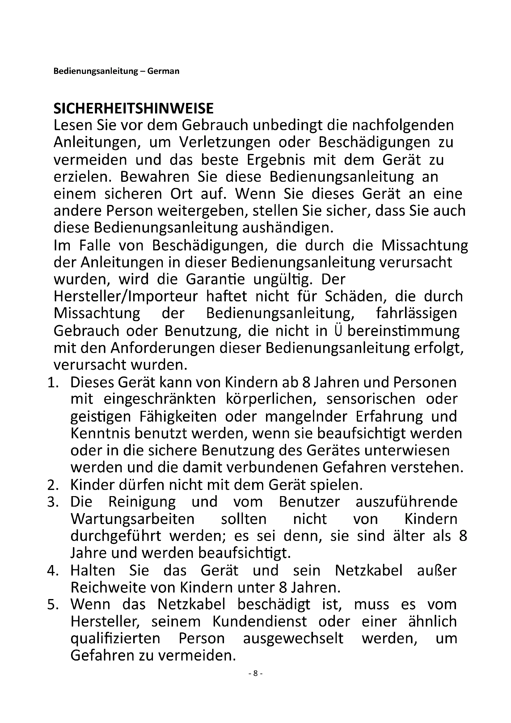 Recycling – European Directive 2012/19/EU This marking indicates that this product should not be disposed with other household wastes. To prevent possible harm to the environment or human health from uncontrolled waste disposal, recycle it responsibly to promote the sustainable reuse of material resources. To return your used device, please use the return and collection systems or contact the retailer where the product was purchased. They can take this product for environmental safe recycling. Manufactured by: Emerio Deutschland GmbH Höffer Weg 14, 51519 Odenthal Germany- 8 - Bedienungsanleitung – German SICHERHEITSHINWEISE Lesen Sie vor dem Gebrauch unbedingt die nachfolgenden Anleitungen, um Verletzungen oder Beschädigungen zu vermeiden und das beste Ergebnis mit dem Gerät zu erzielen. Bewahren Sie diese Bedienungsanleitung an einem sicheren Ort auf. Wenn Sie dieses Gerät an eine andere Person weitergeben, stellen Sie sicher, dass Sie auch diese Bedienungsanleitung aushändigen. Im Falle von Beschädigungen, die durch die Missachtung der Anleitungen in dieser Bedienungsanleitung verursacht wurden, wird die Garantie ungültig. Der Hersteller/Importeur haftet nicht für Schäden, die durch Missachtung der Bedienungsanleitung, fahrlässigen Gebrauch oder Benutzung, die nicht in Übereinstimmung mit den Anforderungen dieser Bedienungsanleitung erfolgt, verursacht wurden.