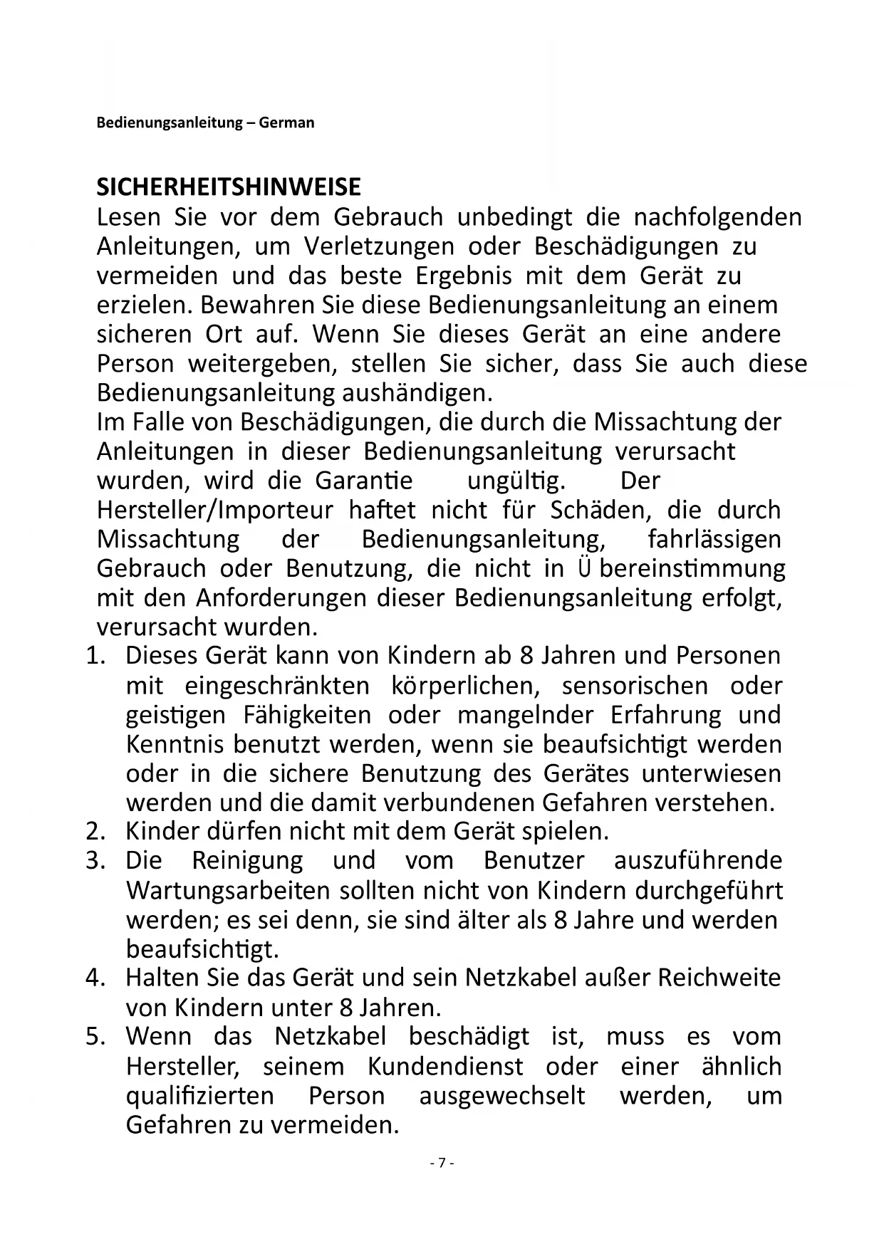 7. Dieses Gerät ist nicht für die Bedienung über einen