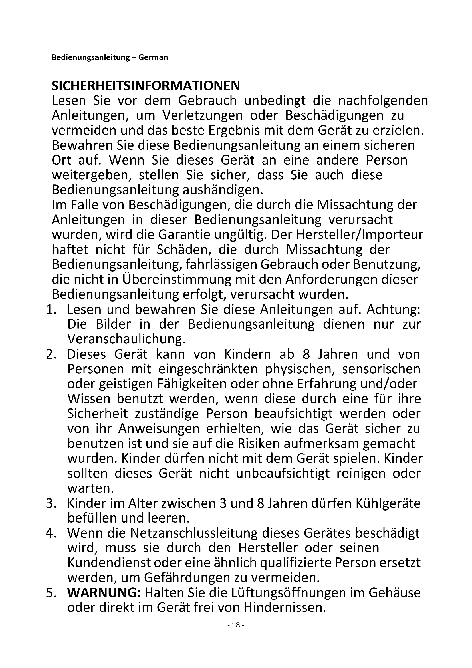 1. Lesen und bewahren Sie diese Anleitungen auf. Achtung: