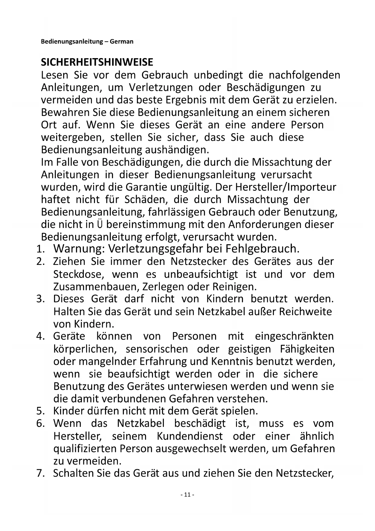 Recycling – European Directive 2012/19/EU This marking indicates that this product should not be disposed with other household wastes. To prevent possible harm to the environment or human health from uncontrolled waste disposal, recycle it responsibly to promote the sustainable reuse of material resources. To return your used device, please use the return and collection systems or contact the retailer where the product was purchased. They can take this product for environmental safe recycling. Manufactured by: Emerio B.V. Zomervaart 1A, 2033 DA Haarlem, The Netherlands- 11 - Bedienungsanleitung – German SICHERHEITSHINWEISE Lesen Sie vor dem Gebrauch unbedingt die nachfolgenden Anleitungen, um Verletzungen oder Beschädigungen zu vermeiden und das beste Ergebnis mit dem Gerät zu erzielen. Bewahren Sie diese Bedienungsanleitung an einem sicheren Ort auf. Wenn Sie dieses Gerät an eine andere Person weitergeben, stellen Sie sicher, dass Sie auch diese Bedienungsanleitung aushändigen. Im Falle von Beschädigungen, die durch die Missachtung der Anleitungen in dieser Bedienungsanleitung verursacht wurden, wird die Garantie ungültig. Der Hersteller/Importeur haftet nicht für Schäden, die durch Missachtung der Bedienungsanleitung, fahrlässigen Gebrauch oder Benutzung, die nicht in Übereinstimmung mit den Anforderungen dieser Bedienungsanleitung erfolgt, verursacht wurden.