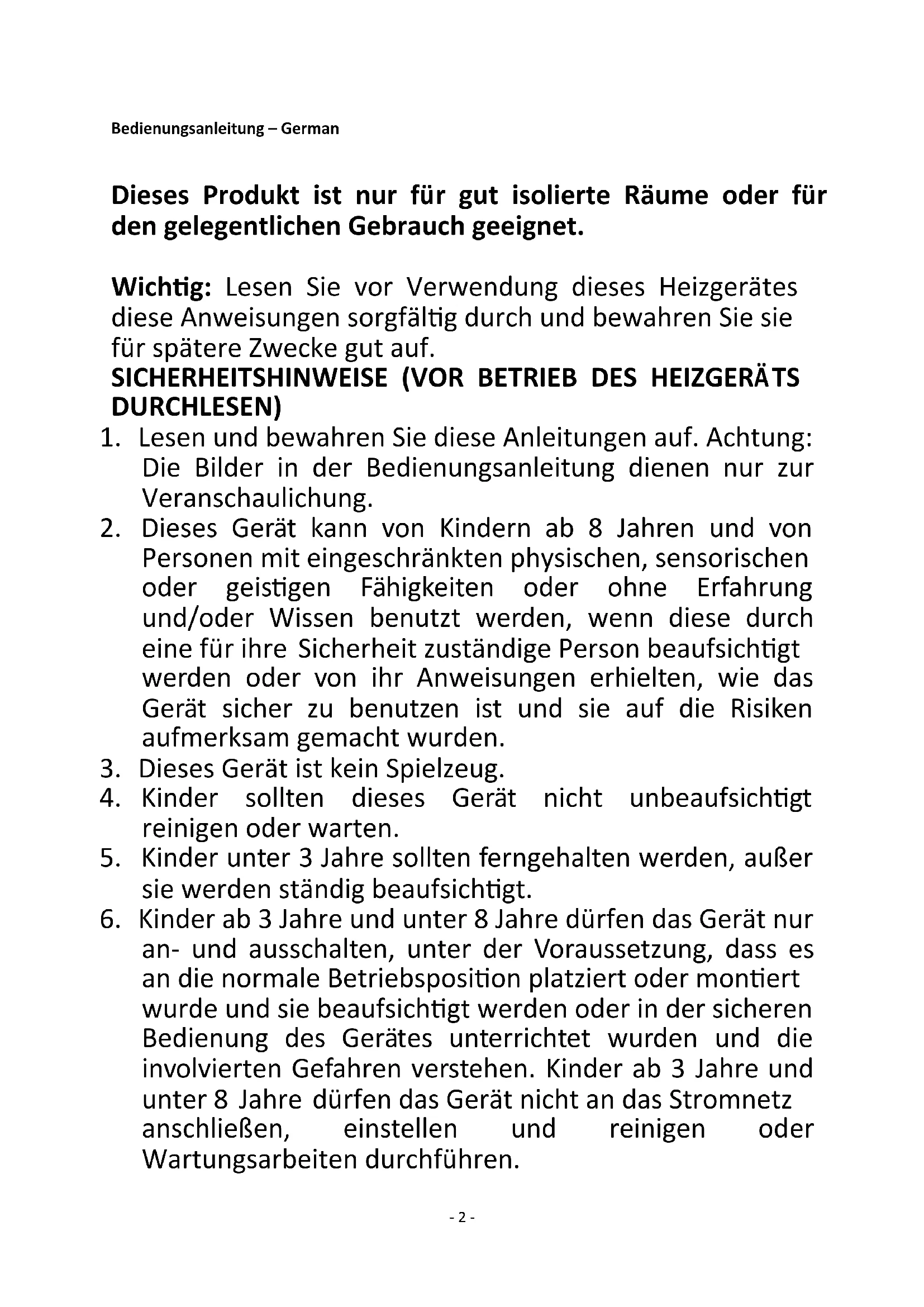 SICHERHEITSHINWEISE (VOR BETRIEB DES HEIZGERÄTS