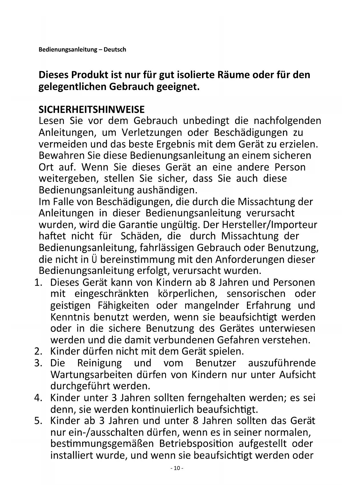 Satisfies the requirement of the Council Directives: COMMISSION REGULATION (EU) No 2015/1188 of 28 April 2015 and Amending COMMISSION REGULATION (EU) 2016/2282 implementing Directive 2009/125/EC of the European Parliament and of the Council with regards to ecodesign requirements for local space heaters Regarding information for consumers on how to install, use and maintain the product, WEEE information, please check the instruction manual provided with packaging.- 10 - Bedienungsanleitung – Deutsch Dieses Produkt ist nur für gut isolierte Räume oder für den gelegentlichen Gebrauch geeignet. SICHERHEITSHINWEISE Lesen Sie vor dem Gebrauch unbedingt die nachfolgenden Anleitungen, um Verletzungen oder Beschädigungen zu vermeiden und das beste Ergebnis mit dem Gerät zu erzielen. Bewahren Sie diese Bedienungsanleitung an einem sicheren Ort auf. Wenn Sie dieses Gerät an eine andere Person weitergeben, stellen Sie sicher, dass Sie auch diese Bedienungsanleitung aushändigen. Im Falle von Beschädigungen, die durch die Missachtung der Anleitungen in dieser Bedienungsanleitung verursacht wurden, wird die Garantie ungültig. Der Hersteller/Importeur haftet nicht für Schäden, die durch Missachtung der Bedienungsanleitung, fahrlässigen Gebrauch oder Benutzung, die nicht in Ü bereinstimmung mit den Anforderungen dieser Bedienungsanleitung erfolgt, verursacht wurden.