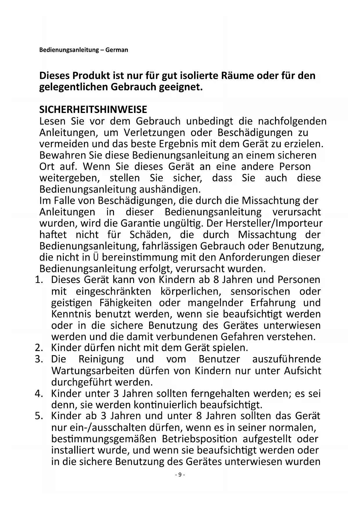Satisfies the requirement of the Council Directives: COMMISSION REGULATION (EU) No 2015/1188 of 28 April 2015 and Amending COMMISSION REGULATION (EU) 2016/2282 implementing Directive 2009/125/EC of the European Parliament and of the Council with regard to ecodesign requirements for local space heaters Regarding information for consumers on how to install, use and maintain the product, WEEE information, please check the instruction manual provided with packaging.- 9 - Bedienungsanleitung – German Dieses Produkt ist nur für gut isolierte Räume oder für den gelegentlichen Gebrauch geeignet. SICHERHEITSHINWEISE Lesen Sie vor dem Gebrauch unbedingt die nachfolgenden Anleitungen, um Verletzungen oder Beschädigungen zu vermeiden und das beste Ergebnis mit dem Gerät zu erzielen. Bewahren Sie diese Bedienungsanleitung an einem sicheren Ort auf. Wenn Sie dieses Gerät an eine andere Person weitergeben, stellen Sie sicher, dass Sie auch diese Bedienungsanleitung aushändigen. Im Falle von Beschädigungen, die durch die Missachtung der Anleitungen in dieser Bedienungsanleitung verursacht wurden, wird die Garantie ungültig. Der Hersteller/Importeur haftet nicht für Schäden, die durch Missachtung der Bedienungsanleitung, fahrlässigen Gebrauch oder Benutzung, die nicht in Ü bereinstimmung mit den Anforderungen dieser Bedienungsanleitung erfolgt, verursacht wurden.
