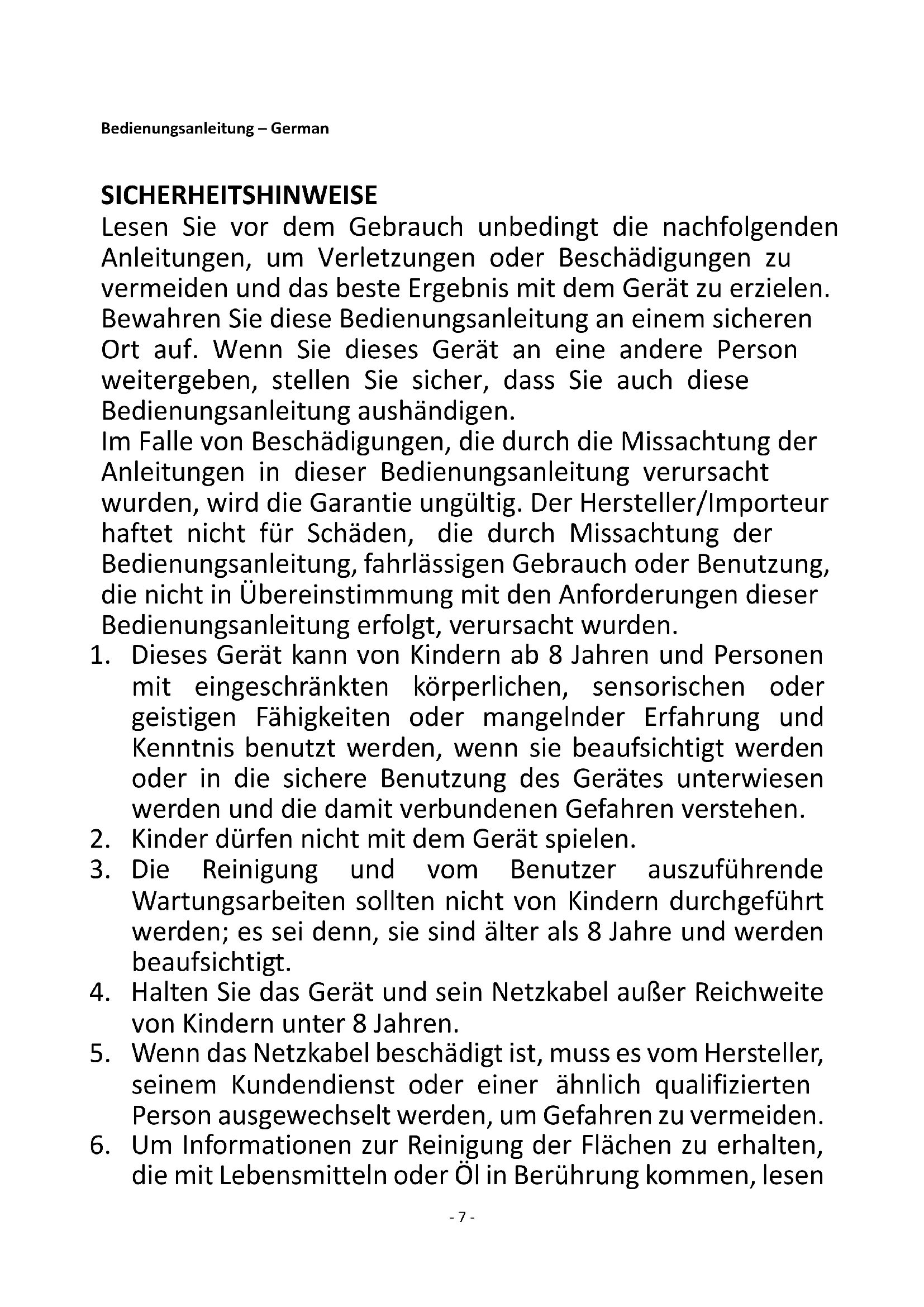 Recycling – European Directive 2012/19/EU This marking indicates that this product should not be disposed with other household wastes. To prevent possible harm to the environment or human health from uncontrolled waste disposal, recycle it responsibly to promote the sustainable reuse of material resources. To return your used device, please use the return and collection systems or contact the retailer where the product was purchased. They can take this product for environmental safe recycling. Emerio B.V. Customer service: Kundeninformation: Klantenservice: Oudeweg 115 T: +31 (0) 23 3034369 T: +49 (0) 3222 1097 600 T: +31 (0) 23 3034369 2031 CC Haarlem www.emerio.eu/service www.emerio.eu/service www.emerio.eu/service The Netherlands Looking for spare parts? Have a look at https://spareparts.emerio.eu Sie brauchen Ersatzteile? Besuchen Sie https://ersatzteile.emerio.eu Onderdelen nodig? Kijk op https://onderdelen.emerio.eu- 7 - Bedienungsanleitung – German SICHERHEITSHINWEISE Lesen Sie vor dem Gebrauch unbedingt die nachfolgenden Anleitungen, um Verletzungen oder Beschädigungen zu vermeiden und das beste Ergebnis mit dem Gerät zu erzielen. Bewahren Sie diese Bedienungsanleitung an einem sicheren Ort auf. Wenn Sie dieses Gerät an eine andere Person weitergeben, stellen Sie sicher, dass Sie auch diese Bedienungsanleitung aushändigen. Im Falle von Beschädigungen, die durch die Missachtung der Anleitungen in dieser Bedienungsanleitung verursacht wurden, wird die Garantie ungültig. Der Hersteller/Importeur haftet nicht für Schäden, die durch Missachtung der Bedienungsanleitung, fahrlässigen Gebrauch oder Benutzung, die nicht in Übereinstimmung mit den Anforderungen dieser Bedienungsanleitung erfolgt, verursacht wurden.