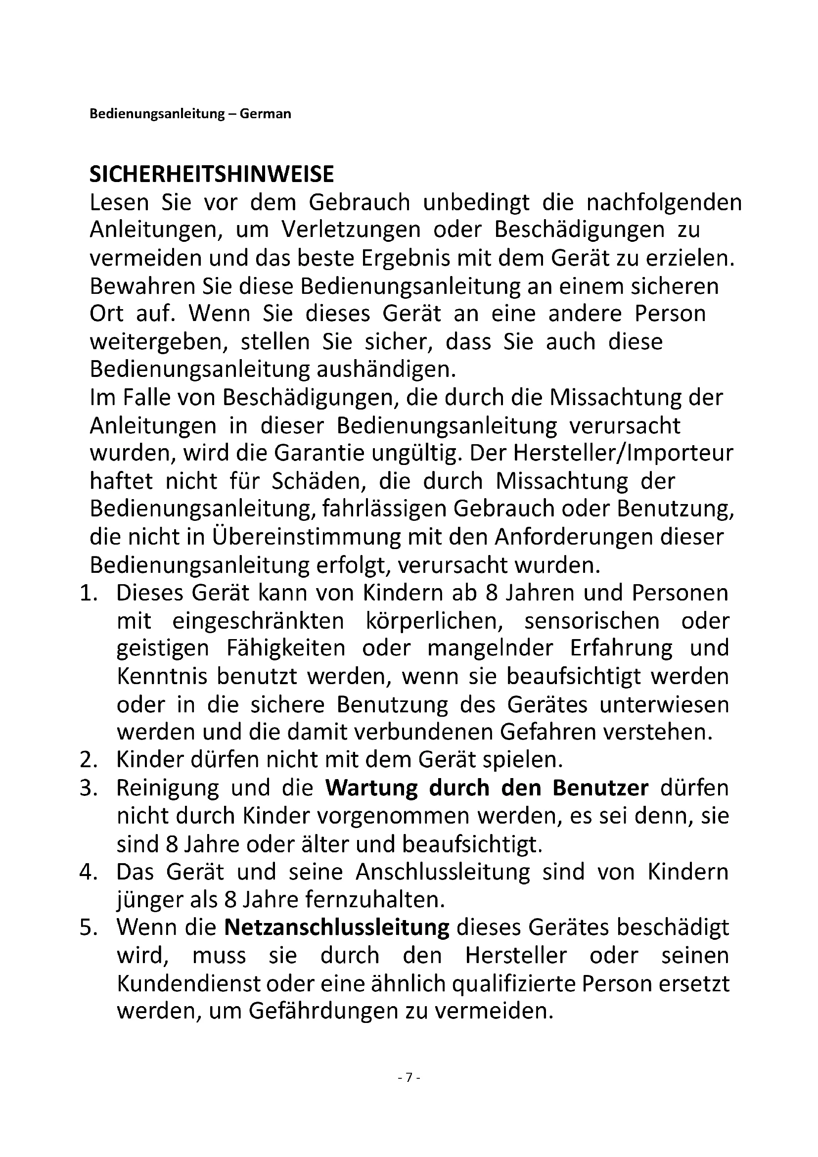 7. Dieses Gerät ist nicht für die Bedienung über einen