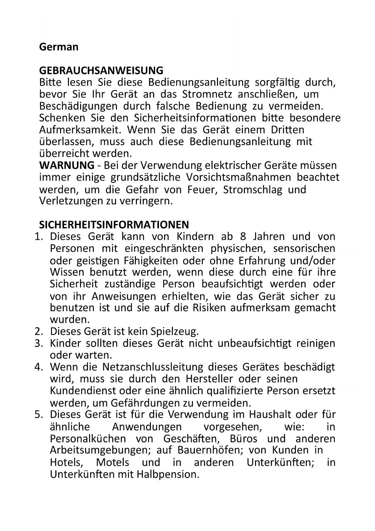 5. Dieses Gerät ist für die Verwendung im Haushalt oder für