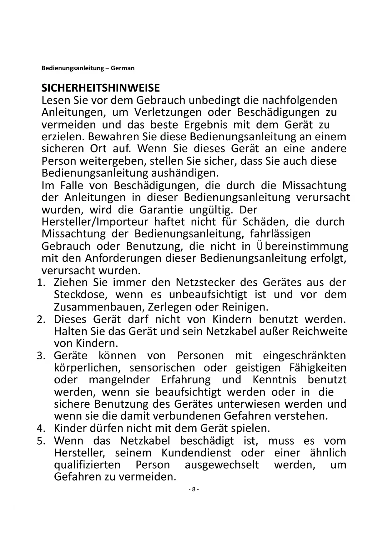 Hersteller, seinem Kundendienst oder einer ähnlich qualifizierten Person ausgewechselt werden, um Gefahren zu vermeiden.- 9 -