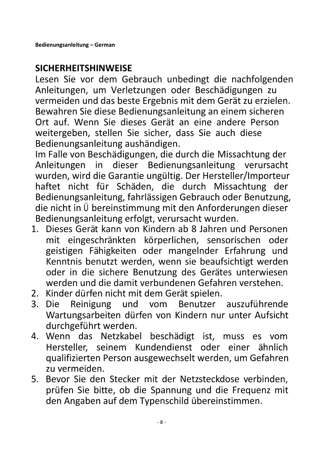 Recycling – European Directive 2012/19/EU This marking indicates that this product should not be disposed with other household wastes. To prevent possible harm to the environment or human health from uncontrolled waste disposal, recycle it responsibly to promote the sustainable reuse of material resources. To return your used device, please use the return and collection systems or contact the retailer where the product was purchased. They can take this product for environmental safe recycling. Emerio Deutschland GmbH (no service address) Lerchenweg 3 40789 Monheim am Rhein Deutschland Customer service: T: +49 (0) 3222 1097 600 E: info.de@emerio.eu- 8 - Bedienungsanleitung – German SICHERHEITSHINWEISE Lesen Sie vor dem Gebrauch unbedingt die nachfolgenden Anleitungen, um Verletzungen oder Beschädigungen zu vermeiden und das beste Ergebnis mit dem Gerät zu erzielen. Bewahren Sie diese Bedienungsanleitung an einem sicheren Ort auf. Wenn Sie dieses Gerät an eine andere Person weitergeben, stellen Sie sicher, dass Sie auch diese Bedienungsanleitung aushändigen. Im Falle von Beschädigungen, die durch die Missachtung der Anleitungen in dieser Bedienungsanleitung verursacht wurden, wird die Garantie ungültig. Der Hersteller/Importeur haftet nicht für Schäden, die durch Missachtung der Bedienungsanleitung, fahrlässigen Gebrauch oder Benutzung, die nicht in Übereinstimmung mit den Anforderungen dieser Bedienungsanleitung erfolgt, verursacht wurden.
