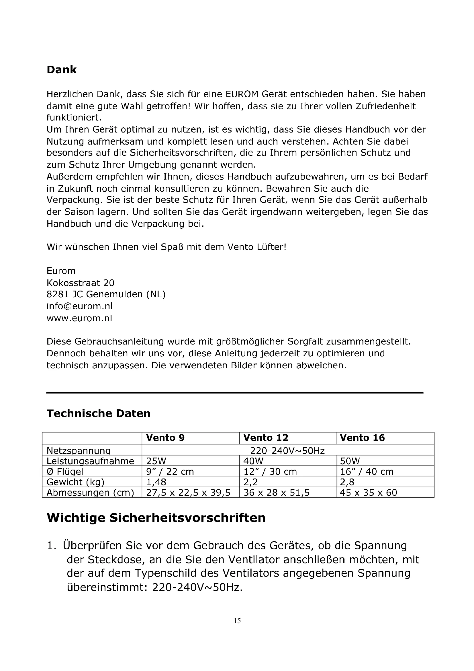 replacing or repairing the electrical cable and plug. Please request original parts if the device needs to be repaired. If the device is subjected to modifications or repairs are carried out by unqualified persons, the guarantees from the supplier, importer and manufacturer will become null and void. Removal In the EU this symbol indicates that this product may not be disposed of as ordinary household waste. Old equipment contains valuable materials, suitable for recycling. These materials should be made suitable for reuse in order to prevent any adverse effects to health and the environment caused by unregulated waste collection. Therefore, please make sure that you bring old equipment to a designated collection point. Alternatively, contact the original supplier, who can make sure that as many of the components as possible can be recycled. CE-declaration See page 34.15 Dank Herzlichen Dank, dass Sie sich für eine EUROM Gerät entschieden haben. Sie haben damit eine gute Wahl getroffen! Wir hoffen, dass sie zu Ihrer vollen Zufriedenheit funktioniert. Um Ihren Gerät optimal zu nutzen, ist es wichtig, dass Sie dieses Handbuch vor der Nutzung aufmerksam und komplett lesen und auch verstehen. Achten Sie dabei besonders auf die Sicherheitsvorschriften, die zu Ihrem persönlichen Schutz und zum Schutz Ihrer Umgebung genannt werden. Außerdem empfehlen wir Ihnen, dieses Handbuch aufzubewahren, um es bei Bedarf in Zukunft noch einmal konsultieren zu können. Bewahren Sie auch die Verpackung. Sie ist der beste Schutz für Ihren Gerät, wenn Sie das Gerät außerhalb der Saison lagern. Und sollten Sie das Gerät irgendwann weitergeben, legen Sie das Handbuch und die Verpackung bei. Wir wünschen Ihnen viel Spaß mit dem Vento Lüfter! Eurom Kokosstraat 20 8281 JC Genemuiden (NL) info@eurom.nl www.eurom.nl Diese Gebrauchsanleitung wurde mit größtmöglicher Sorgfalt zusammengestellt. Dennoch behalten wir uns vor, diese Anleitung jederzeit zu optimieren und technisch anzupassen. Die verwendeten Bilder können abweichen.