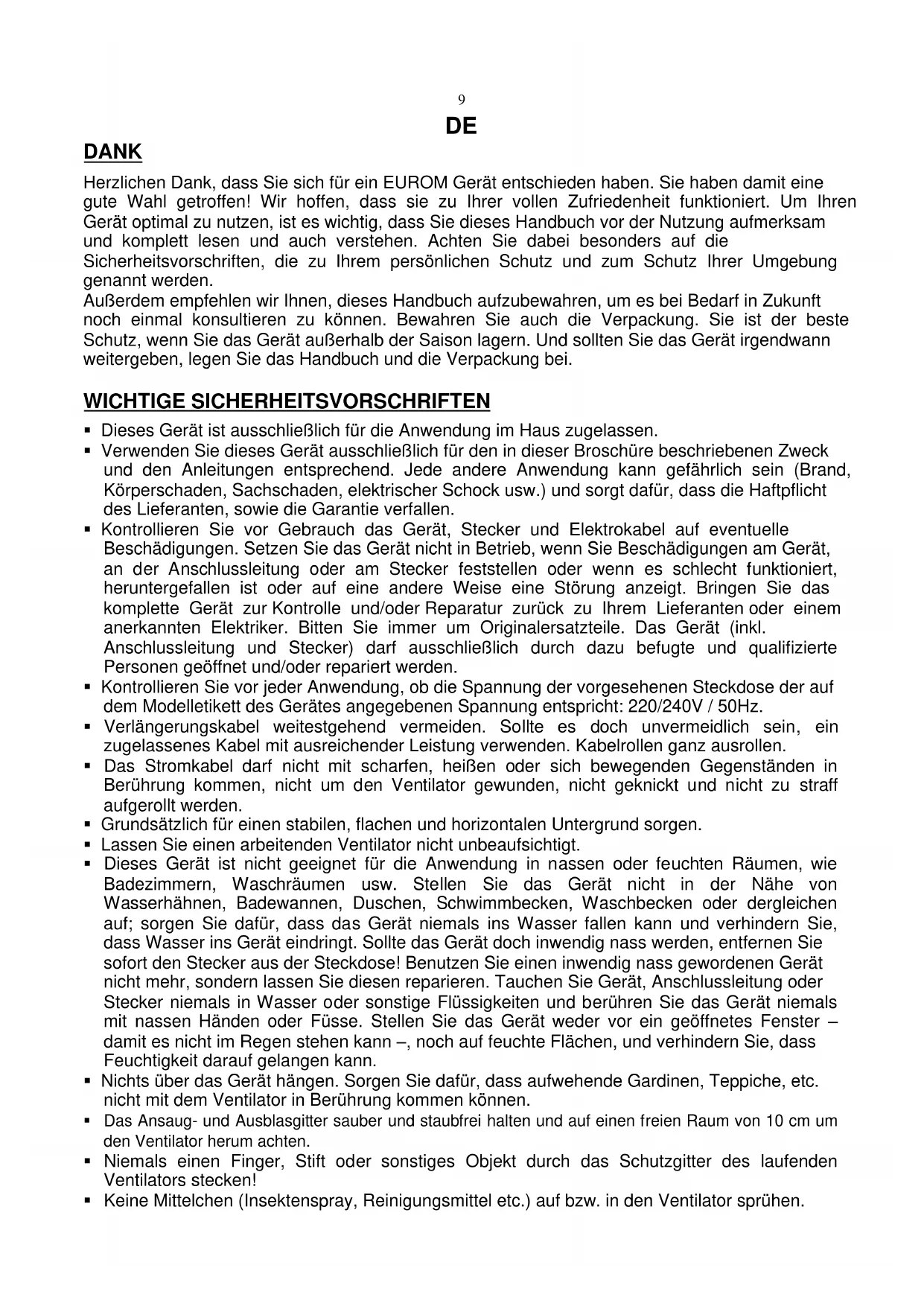 DANK Herzlichen Dank, dass Sie sich für ein EUROM Gerät entschieden haben. Sie haben damit eine gute Wahl getroffen! Wir hoffen, dass sie zu Ihrer vollen Zufriedenheit funktioniert. Um Ihren Gerät optimal zu nutzen, ist es wichtig, dass Sie dieses Handbuch vor der Nutzung aufmerksam und komplett lesen und auch verstehen. Achten Sie dabei besonders auf die Sicherheitsvorschriften, die zu Ihrem persönlichen Schutz und zum Schutz Ihrer Umgebung genannt werden. Außerdem empfehlen wir Ihnen, dieses Handbuch aufzubewahren, um es bei Bedarf in Zukunft noch einmal konsultieren zu können. Bewahren Sie auch die Verpackung. Sie ist der beste Schutz, wenn Sie das Gerät außerhalb der Saison lagern. Und sollten Sie das Gerät irgendwann weitergeben, legen Sie das Handbuch und die Verpackung bei. WICHTIGE SICHERHEITSVORSCHRIFTEN Dieses Gerät ist ausschließlich für die Anwendung im Haus zugelassen. Verwenden Sie dieses Gerät ausschließlich für den in dieser Broschüre beschriebenen Zweck und den Anleitungen entsprechend. Jede andere Anwendung kann gefährlich sein (Brand, Körperschaden, Sachschaden, elektrischer Schock usw.) und sorgt dafür, dass die Haftpflicht des Lieferanten, sowie die Garantie verfallen. Kontrollieren Sie vor Gebrauch das Gerät, Stecker und Elektrokabel auf eventuelle Beschädigungen. Setzen Sie das Gerät nicht in Betrieb, wenn Sie Beschädigungen am Gerät, an der Anschlussleitung oder am Stecker feststellen oder wenn es schlecht funktioniert, heruntergefallen ist oder auf eine andere Weise eine Störung anzeigt. Bringen Sie das komplette Gerät zur Kontrolle und/oder Reparatur zurück zu Ihrem Lieferanten oder einem anerkannten Elektriker. Bitten Sie immer um Originalersatzteile. Das Gerät (inkl. Anschlussleitung und Stecker) darf ausschließlich durch dazu befugte und qualifizierte Personen geöffnet und/oder repariert werden. Kontrollieren Sie vor jeder Anwendung, ob die Spannung der vorgesehenen Steckdose der auf dem Modelletikett des Gerätes angegebenen Spannung entspricht: 220/240V / 50Hz. Verlängerungskabel weitestgehend vermeiden. Sollte es doch unvermeidlich sein, ein zugelassenes Kabel mit ausreichender Leistung verwenden. Kabelrollen ganz ausrollen. Das Stromkabel darf nicht mit scharfen, heißen oder sich bewegenden Gegenständen in Berührung kommen, nicht um den Ventilator gewunden, nicht geknickt und nicht zu straff aufgerollt werden. Grundsätzlich für einen stabilen, flachen und horizontalen Untergrund sorgen. Lassen Sie einen arbeitenden Ventilator nicht unbeaufsichtigt. Dieses Gerät ist nicht geeignet für die Anwendung in nassen oder feuchten Räumen, wie Badezimmern, Waschräumen usw. Stellen Sie das Gerät nicht in der Nähe von Wasserhähnen, Badewannen, Duschen, Schwimmbecken, Waschbecken oder dergleichen auf; sorgen Sie dafür, dass das Gerät niemals ins Wasser fallen kann und verhindern Sie, dass Wasser ins Gerät eindringt. Sollte das Gerät doch inwendig nass werden, entfernen Sie sofort den Stecker aus der Steckdose! Benutzen Sie einen inwendig nass gewordenen Gerät nicht mehr, sondern lassen Sie diesen reparieren. Tauchen Sie Gerät, Anschlussleitung oder Stecker niemals in Wasser oder sonstige Flüssigkeiten und berühren Sie das Gerät niemals mit nassen Händen oder Füsse. Stellen Sie das Gerät weder vor ein geöffnetes Fenster – damit es nicht im Regen stehen kann –, noch auf feuchte Flächen, und verhindern Sie, dass Feuchtigkeit darauf gelangen kann. Nichts über das Gerät hängen. Sorgen Sie dafür, dass aufwehende Gardinen, Teppiche, etc. nicht mit dem Ventilator in Berührung kommen können. Das Ansaug- und Ausblasgitter sauber und staubfrei halten und auf einen freien Raum von 10 cm um den Ventilator herum achten. Niemals einen Finger, Stift oder sonstiges Objekt durch das Schutzgitter des laufenden Ventilators stecken! Keine Mittelchen (Insektenspray, Reinigungsmittel etc.) auf bzw. in den Ventilator sprühen.10 Verwenden und lagern Sie den Ventilator nicht: - an Stellen, wo es nass werden kann oder das Gerät ins Wasser fallen kann - in der Nähe von leicht entzündbaren, explosions-gefährlichen oder gasförmigen Stoffen - in der Nähe von Säuren, Alkali, Öl und anderen korrosiven Stoffen Schließen Sie den Ventilator nicht an eine Schaltuhr oder einen Dimmer an. Den Ventilator vor dem Umsetzen, Reinigung oder Wartung erst ausschalten und den Stecker aus der Steckdose ziehen. Tun Sie dies auch, wenn der Ventilator nicht verwendet wird. Nehmen Sie den Stecker dazu in die Hand, ziehen Sie niemals an der Anschlussleitung. Den Stecker nach Gebrauch immer aus der Steckdose ziehen. Dieses Gerät eignet sich nicht dazu, von Kindern oder Personen mit einer körperlichen, sinnlichen oder geistigen Behinderung, bzw. mit mangelnder Erfahrung und Kenntnissen benutzt zu werden, unabhängig davon, ob Aufsicht, bzw. für das Wohlbefinden der Betreffenden Verantwortliche anwesend sind. Diese Personen, sowie Haustiere, vom Gerät fernhalten. TECHNISCHE DATEN Model VTW33 Anschlussspannung 220-240V / 50Hz Angegebene Leistung W 50W Höhe Ventilator 17” (42 cm) Gewicht (kg) 2,5 kg Maβe (cm) 13(26) x 15(26) x 84 cm