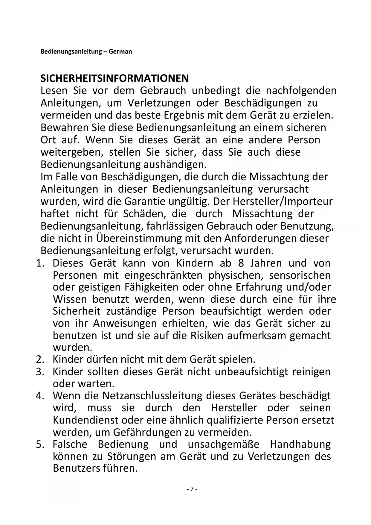 Regarding information for consumers on how to install, use and maintain the product, WEEE information, please check the instruction manual provided with packaging.- 7 - Bedienungsanleitung – German SICHERHEITSINFORMATIONEN Lesen Sie vor dem Gebrauch unbedingt die nachfolgenden Anleitungen, um Verletzungen oder Beschädigungen zu vermeiden und das beste Ergebnis mit dem Gerät zu erzielen. Bewahren Sie diese Bedienungsanleitung an einem sicheren Ort auf. Wenn Sie dieses Gerät an eine andere Person weitergeben, stellen Sie sicher, dass Sie auch diese Bedienungsanleitung aushändigen. Im Falle von Beschädigungen, die durch die Missachtung der Anleitungen in dieser Bedienungsanleitung verursacht wurden, wird die Garantie ungültig. Der Hersteller/Importeur haftet nicht für Schäden, die durch Missachtung der Bedienungsanleitung, fahrlässigen Gebrauch oder Benutzung, die nicht in Übereinstimmung mit den Anforderungen dieser Bedienungsanleitung erfolgt, verursacht wurden.