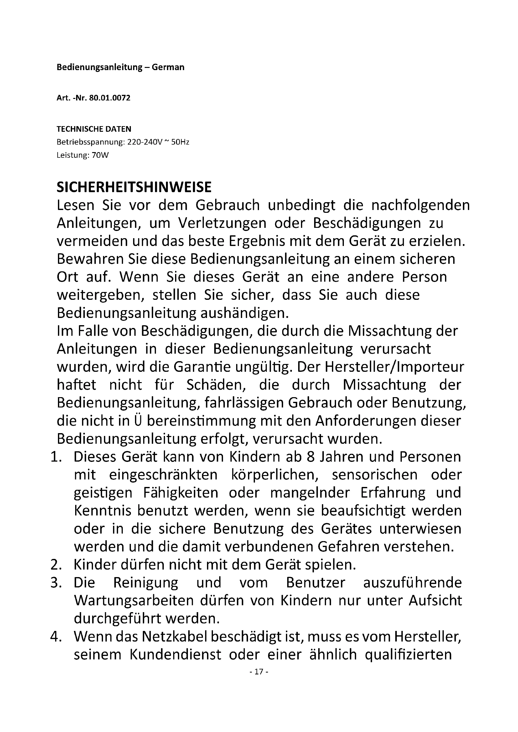 15. Dieses Gerät ist nicht für den gewerblichen Gebrauch