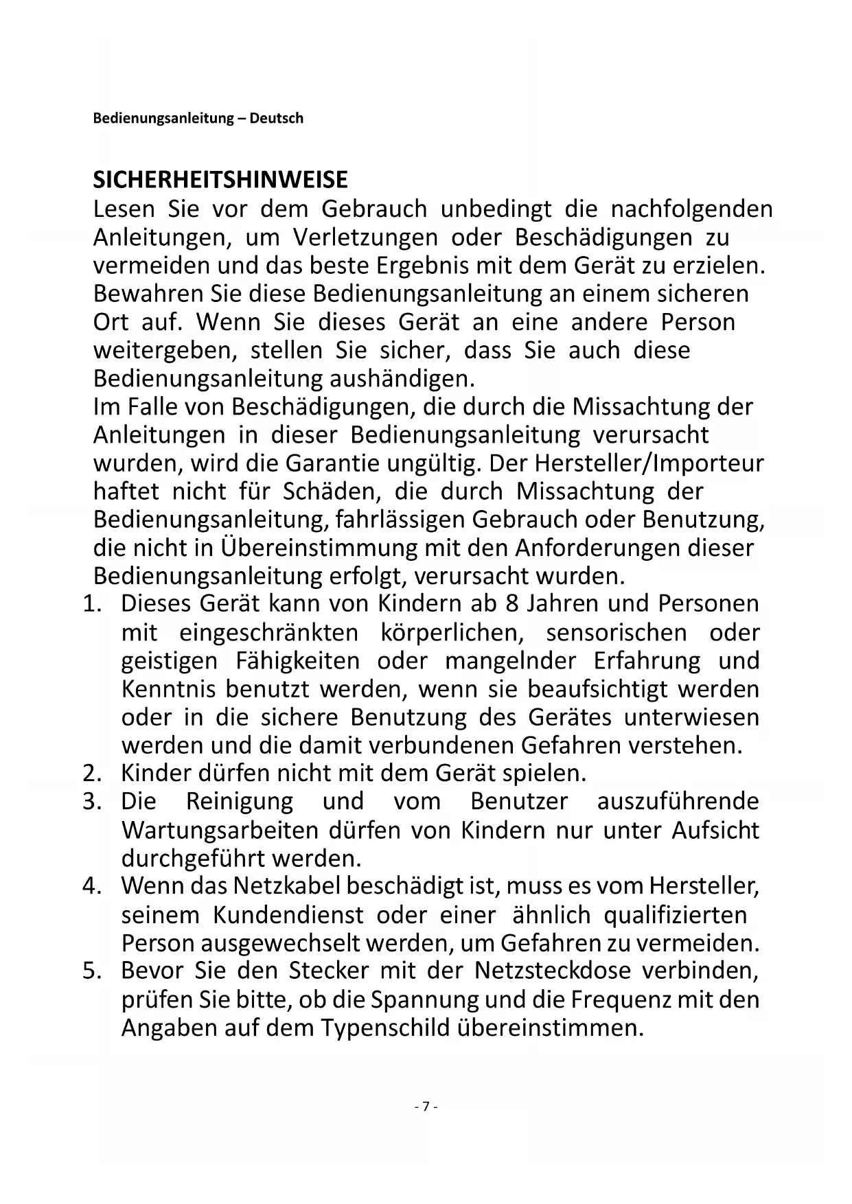 “Regarding information for consumers on how to install, use and maintain the product, WEEE information, please check the instruction manual provided with packaging.”- 7 - Bedienungsanleitung – Deutsch SICHERHEITSHINWEISE Lesen Sie vor dem Gebrauch unbedingt die nachfolgenden Anleitungen, um Verletzungen oder Beschädigungen zu vermeiden und das beste Ergebnis mit dem Gerät zu erzielen. Bewahren Sie diese Bedienungsanleitung an einem sicheren Ort auf. Wenn Sie dieses Gerät an eine andere Person weitergeben, stellen Sie sicher, dass Sie auch diese Bedienungsanleitung aushändigen. Im Falle von Beschädigungen, die durch die Missachtung der Anleitungen in dieser Bedienungsanleitung verursacht wurden, wird die Garantie ungültig. Der Hersteller/Importeur haftet nicht für Schäden, die durch Missachtung der Bedienungsanleitung, fahrlässigen Gebrauch oder Benutzung, die nicht in Übereinstimmung mit den Anforderungen dieser Bedienungsanleitung erfolgt, verursacht wurden.