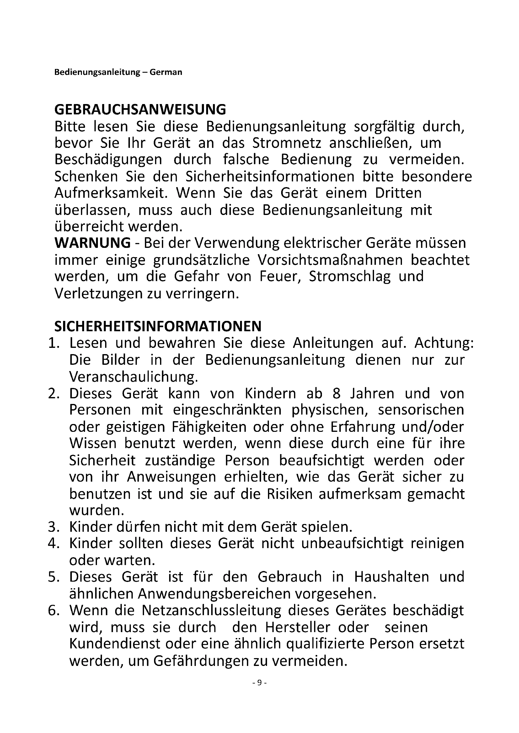 Regarding information for consumers on how to install, use and maintain the product, WEEE information, please check the instruction manual provided with packaging.- 9 - Bedienungsanleitung – German GEBRAUCHSANWEISUNG Bitte lesen Sie diese Bedienungsanleitung sorgfältig durch, bevor Sie Ihr Gerät an das Stromnetz anschließen, um Beschädigungen durch falsche Bedienung zu vermeiden. Schenken Sie den Sicherheitsinformationen bitte besondere Aufmerksamkeit. Wenn Sie das Gerät einem Dritten überlassen, muss auch diese Bedienungsanleitung mit überreicht werden. WARNUNG - Bei der Verwendung elektrischer Geräte müssen immer einige grundsätzliche Vorsichtsmaßnahmen beachtet werden, um die Gefahr von Feuer, Stromschlag und Verletzungen zu verringern. SICHERHEITSINFORMATIONEN