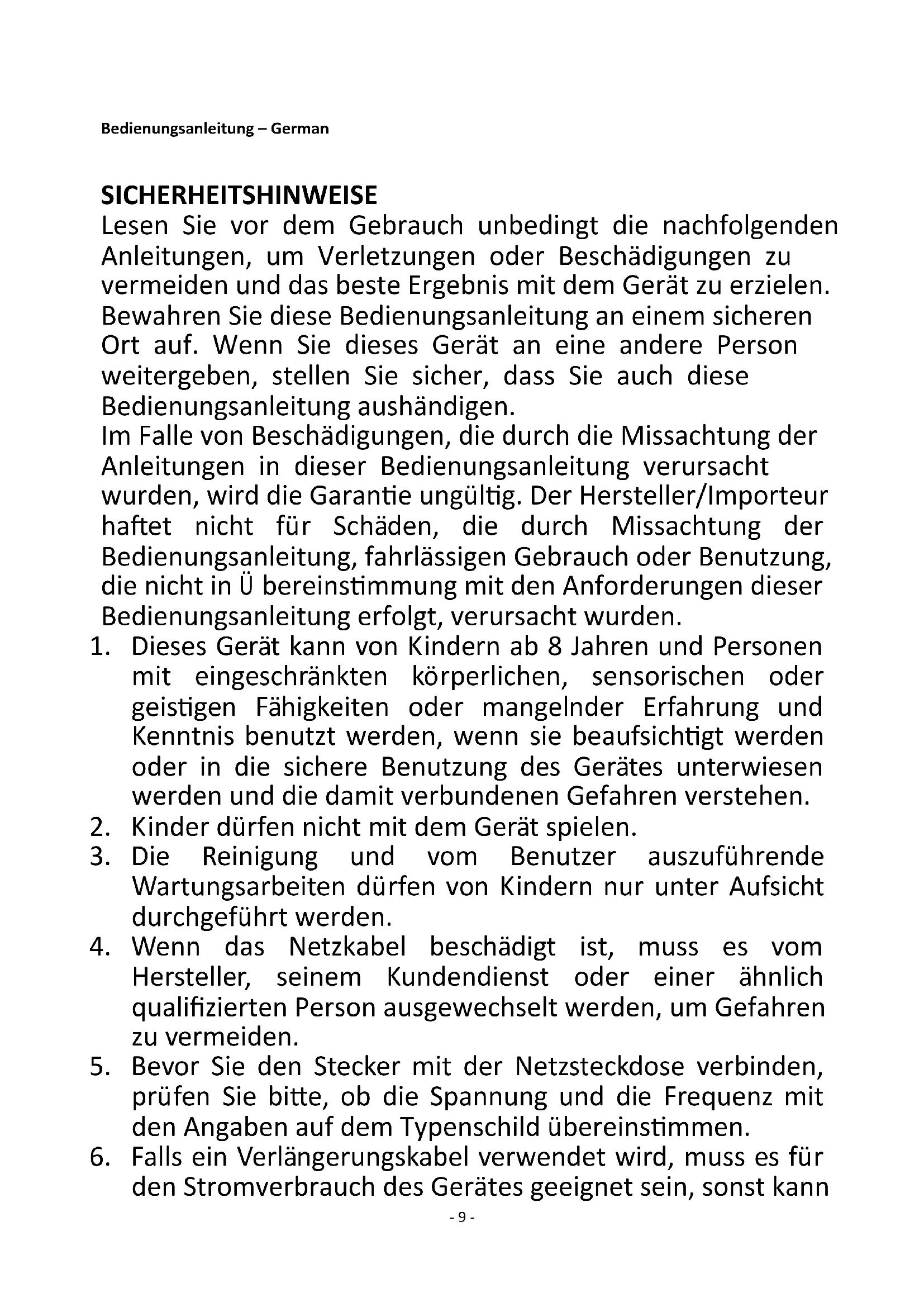 Regarding information for consumers on how to install, use and maintain the product, WEEE information, please check the instruction manual provided with packaging.- 9 - Bedienungsanleitung – German SICHERHEITSHINWEISE Lesen Sie vor dem Gebrauch unbedingt die nachfolgenden Anleitungen, um Verletzungen oder Beschädigungen zu vermeiden und das beste Ergebnis mit dem Gerät zu erzielen. Bewahren Sie diese Bedienungsanleitung an einem sicheren Ort auf. Wenn Sie dieses Gerät an eine andere Person weitergeben, stellen Sie sicher, dass Sie auch diese Bedienungsanleitung aushändigen. Im Falle von Beschädigungen, die durch die Missachtung der Anleitungen in dieser Bedienungsanleitung verursacht wurden, wird die Garantie ungültig. Der Hersteller/Importeur haftet nicht für Schäden, die durch Missachtung der Bedienungsanleitung, fahrlässigen Gebrauch oder Benutzung, die nicht in Übereinstimmung mit den Anforderungen dieser Bedienungsanleitung erfolgt, verursacht wurden.