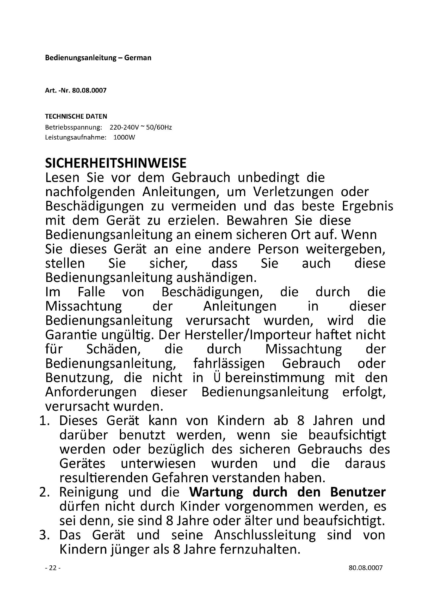 für den Stromverbrauch des Gerätes geeignet sein, sonst kann es zum Ü berhitzen des- 24 - 80.08.0007 Verlängerungskabels und/oder des Steckers kommen. Es besteht Verletzungsgefahr durch Stolpern über das Verlängerungskabel. Lassen Sie Vorsicht walten, um gefährliche Situationen zu vermeiden.