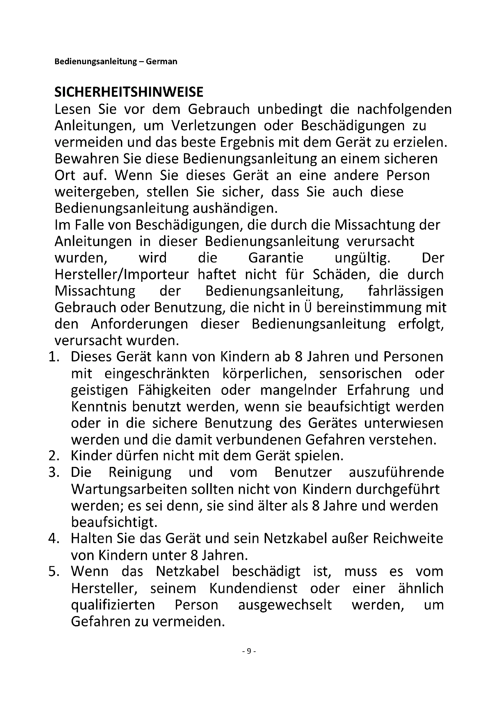Hersteller, seinem Kundendienst oder einer ähnlich qualifizierten Person ausgewechselt werden, um Gefahren zu vermeiden.- 10 -